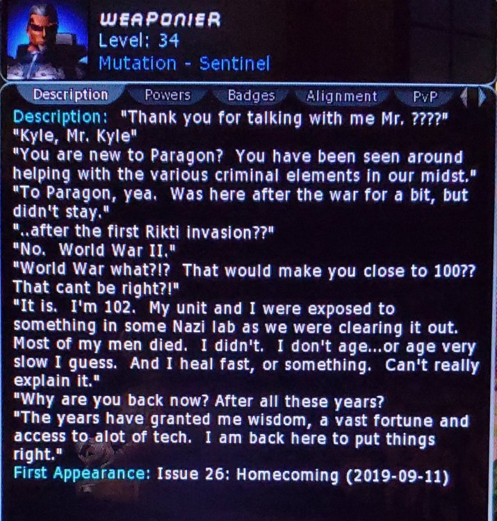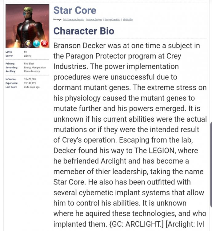 The above 2 back stories are intertwined, as Weaponier was the first person to find Star-Core after he destroyed the Crey facility. He was also the one who implanted Star-Core's cybernetics to keep his powers in check. He then moved Star-Core to a location where he would quickly be taken in by The LEGION, and Arclight (my main toon).