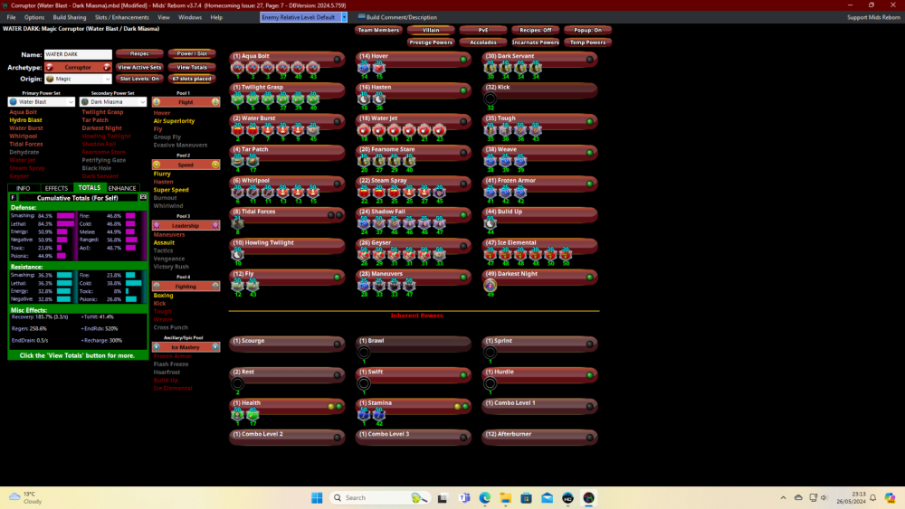 11. My mids figures are all over the place so i don't know what help it'll be. At first glance your going to require destiny ageless/alpha cardiac or vigor, or maybe both, to run all those toggles or you'll have 0 blue after a single attack chain. Don't bother slotting the OF in whirlpool, i don't even think its worth the 2 procs i chucked in they only have a chance to fire off something like once/10 seconds. You didn't put anything in health, you'd want at least the panacea and miracle in there and i'd try to find a slot for the preventetive. You can see how off my mids is, all those toggles running and its only showing 0.5 end drain, which makes me wonder if the def+res+recharge figures are just as off. Corruptor (Water Blast - Dark Miasma).mbd