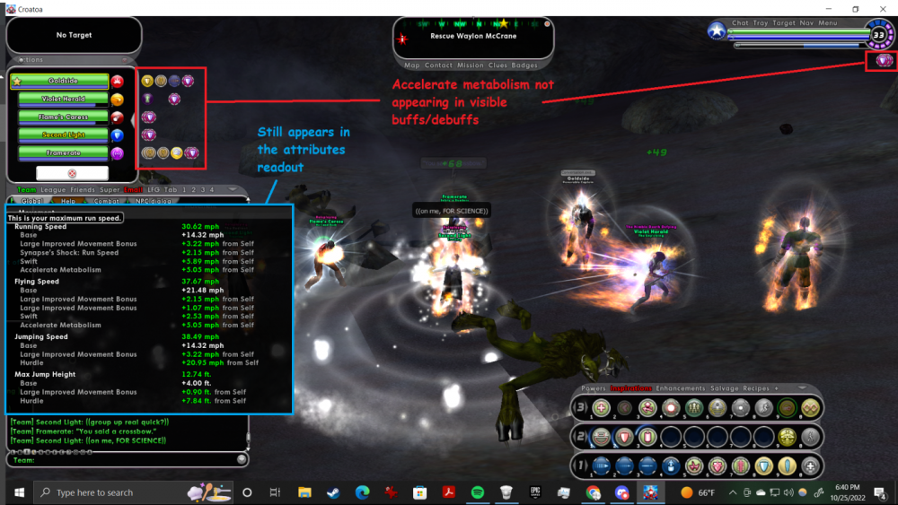 A cosmetic issue, but a gnarly one: whenever my Defender, Second Light, uses [Accelerate Metabolism], it doesn't visualize on my or any other player's buff icon bar. Mechanically, the buff lands, but nobody sees it and we can't track uptime.- 1 reply