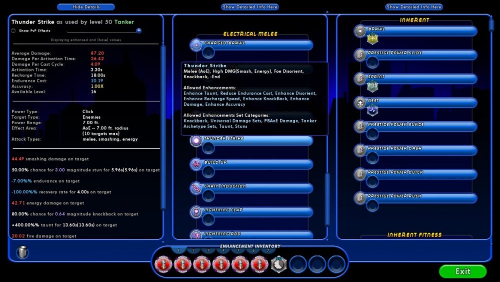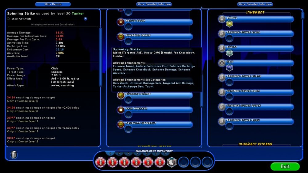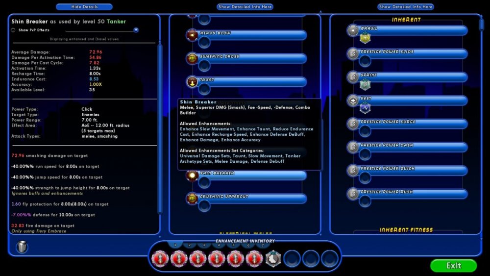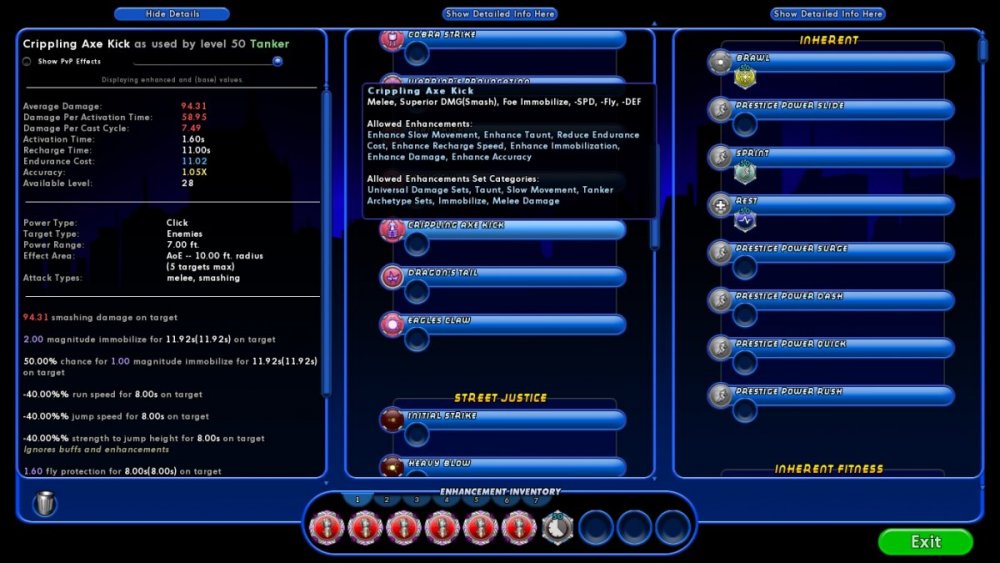 2. Is there any solid reason why Defense Debuff enhancements can go into Shin Breaker (Street Justice power), but cannot go into Crippling Axe Kick (Martial Arts power). Both of them have primary role of dealing damage, but they both have -DEF component in them. Yet one's -DEF can be enhanced, while other can't. Also Shin Breaker, unlike Crippling Axe Kick, can accept Achilles' Heel unique (-RES). Another strangeness is Street Justice power - Spinning Strike, it accepts Targeted AoE Damage Sets. But it suggests that it should be melee power, while Targeted AoE Damage is made for ranged powers, and melee AoE's usually accept PBAoE Damage Sets. Electrical Melee - Thunder Strike power accepts PBAoE (aka Melee AoE) Sets. Lastly 3rd example is Radiation Armor power "Ground Zero", which can accept Heal Enhancements and Accuracy Enhancements, but not Accurate Healing Sets. Another Rad Armor power "Radiation Therapy" can accept Accurate Healing though (despite it has x3 default accuracy modifier, probably the highest in game). Also for some reason Trap's Web Grenade may slow movement speed, but doesn't accept SLOW sets. Force Fields and Scorpion Shield don't improve resistance with +RES sets (some of these powers have RES components but also tagged as Ignores Buffs and Enhancements), but l believe latter is intended. If power slot tagging for accessible enhancements is being done manually, there should be plenty of examples for improper power tagging, but they ought to be getting fixed eventually. If you find some of these inconsistences - please - let everyone know. It reminds me as one day (read that in one of guides) an Acid Mortar (Traps) power was accepting Ranged AoE Sets (those are made for Single Target attacks, but now these can't be put into Acid Mortar; Targeted AoE ones can).