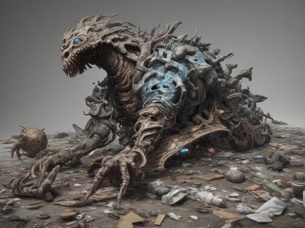 So, still trying to find something apropos for my living garbage concept creature/character. Current prompts are: 3d CGI render of a large creature made of corpses and garbage. I changed it to large amorphous creature and got...less than optimal results. Changed amorphous to shapeless and got that final one.