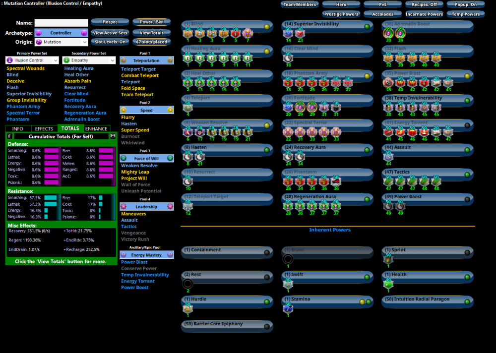 The mission was tailored specifically to benchmark builds for +4x8 missions by Ston, a person known for buildmaking, testing and benchmarking, and has a variety of enemies including an elite boss, rikti, nemesis, and crey with variant mob spread. It's not a cakewalk by any means. The players, well this is gonna sound horribly condescending, but me and @BRADICAL are quite well respected in both the forums and discord community as buildmakers. We would have loved more people to participate in the controller part of benchmarking, but keep in mind that if it was that easy to beat those numbers then others would have joined in. Regarding the fact that there are only 5 controller builds, well there is a reason those builds were chosen. Illusion is the premier DPS primary for controllers due to Phantom Army, and Marine is the premier AoE secondary due to procced Whitecap and one of the best DPS primaries if you have a lot of pets/teammates to trigger Shifting Tides (and illusion has the highest number of active pets). With all that being said, there are definitely a lot of cool and strong builds not on this list! As an example, I've been enjoying Symphony/Sonic/Energy lately, because of the combo of procced Liquefy giving Containment and clear cone positioning to Confounding Chant, Energy Torrent and Dreadful Discord.