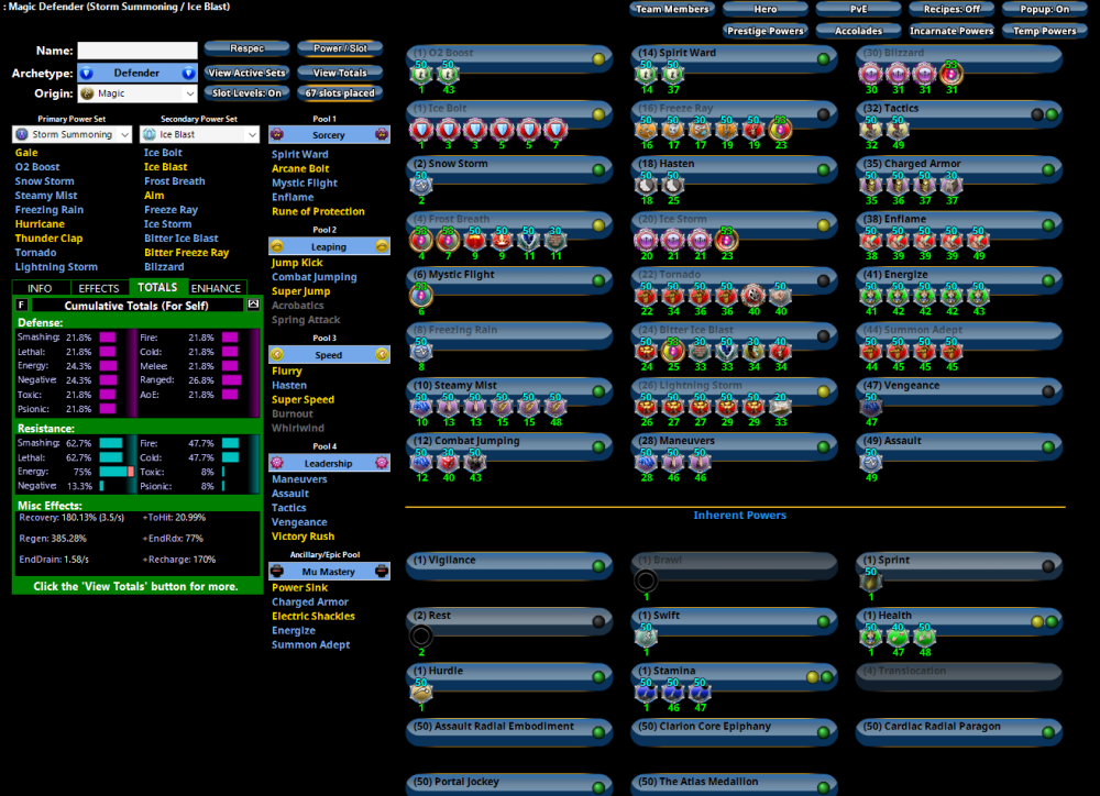1. Shoal Rush Generally a skip, as of the two must-pick powers it has less slotting options and end-game utility. 2. Soothing Wave You can slot this with a healing set, or just place the Preventive Medicine proc in it: 3. Toroidal Bubble This is where you slot your resistance sets. 3pc Gladiator for the KB protection and defense, Steadfast Protection for defense, and an EndMod IO for endurance: 4. Whitecap As many procs as you can fit while maintaining 95% chance to hit +3 mobs. -Res, purple damage proc, and Force Feedback procs are the highest priority. A high-end build should aim to reach 95% accuracy without any slotting (Kismet IO and Tactics helps): 5. Tide Pool Either an Endurance Reduction IO or a Slow Mod IO. Endurance Reduction will be better while leveling, but you don't have a way to keep stuff from running away as a Corr so the slow mod can help when soloing stuff once your build is fleshed out: 6. Brine Either an Acc/Heal Hami or just a straight-up +5 Heal IO. While leveling you do want Accuracy, but since we already aim to get 95% chance to hit without slotting, you can just slot a Heal IO in there once the build is done: 7. Shifting Tides This is the most interesting slotting. Since the power passively affects both enemies and allies, the ATO proc gives you and your team a heal and endurance pretty much every 10s, and the Gauss proc gives you a build-up at a similar interval. You can split the ATO set by 3-slotting to get more recharge, or you can get more accuracy out of 4-slotting it to help with fully-proccing whitecap: 8. Barrier Reef We always want the LotG IO here. Some people like to slot some defense here, but since its defense is unreliable my preferred slotting is to slot a 5-piece Panacea for the recharge and absorb. Panacea proc can proc on allies in this power: 9. Power of the Depths You always want the 5-piece Panacea here. As for the 6th slot, the EndMod/Rech hami/d-sync or a simple +5 EndMod IO (if you +5 all rech pieces): That's pretty much it, slotting for procs and sets.