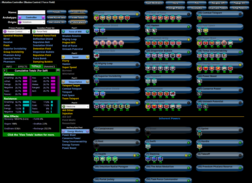 Here's one for you, has the following in its toolkit: 1. Weaken Resolve as an early attack and more -res for your Phantom Army damage 2. Wail of Force as an early spammable AoE and a way to get more recharge for perma Phantom Army via the FFB proc 3. Proc bomb AoE's to have solid AoE damage output and allow PA to focus on LT's and bosses 4. Fold Space to place mobs in your fear and AoE zone 5. Combat TP for cone AoE positioning (you want a powexec_location macro to combat TP to the back for cones) 6. Endurance Sustain cycling of Conserve Power / Unleash Potential to facilitate the proc bomb spam 7. Procced ST attacks for more DPS 8. Power Boost for better FF shields, CC's, and Unleash Potential Optional change: Remove the +def in Deflection/Insulation shields for slots into Deceive+Spectral Terror for +10% ranged defense Controller (Illusion Control - Force Field).mbd Controller (Illusion Control - Force Field) v2.mbd