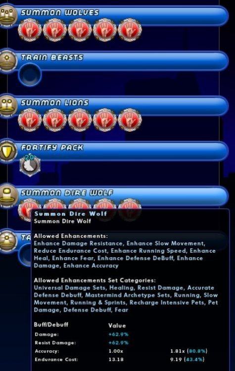 Not sure why this is happening but the enhancements I have slotted into the power, a set of Attuned Blood Mandate (minus the Acc/End enhancement), are showing the wrong values on the enhancement screen. The damage is showing values (at lvl 40) of only 62.9% while the exact same IO's slotted into Summon Wolves and Summon Lions show the damage at 95.9%. Also, for some reason there is a Resist Damage value on the Summon Dire Wolf showing the same value as the damage, 62.9%, despite there being no Dam Res slotted. Wondering if this is simply a reporting error somewhere or if the power is actually not getting correct damage and then getting either a damage resist buff/debuff incorrectly.