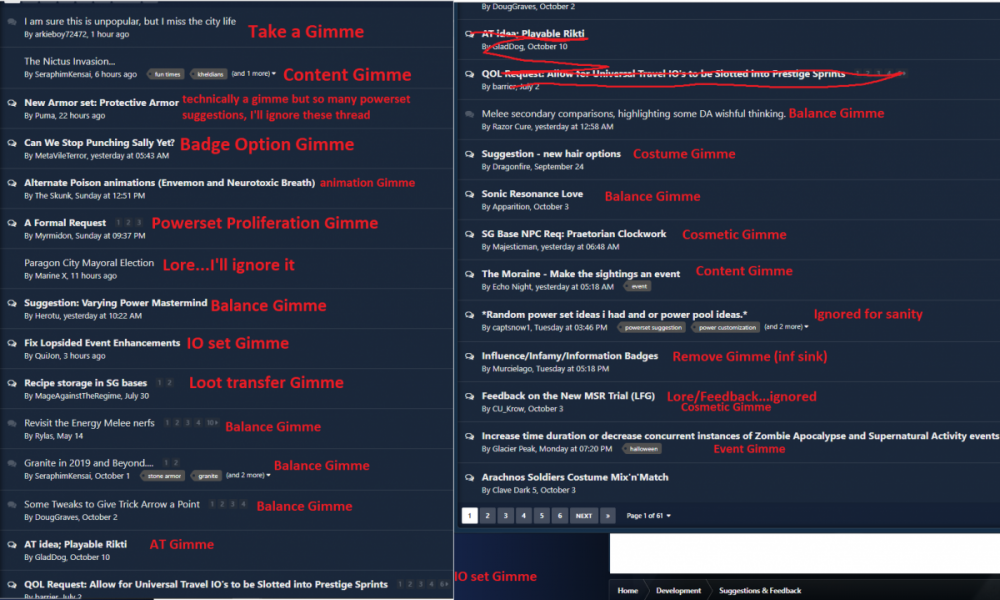 If they aren't asking for a nerf, then they are gimmes. I don't count Powerset suggestions or AT suggestions (despite me mentioning an AT proposal as a gimme) as gimmes because those are more like forum games rather than sincere requests to the developers. -