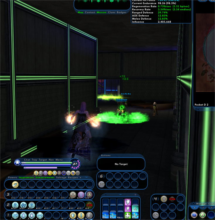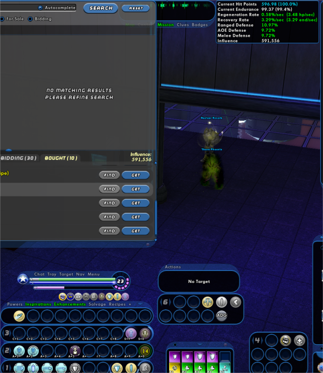 15. Day 5 I did Agent Watkins Story Arc. I collected some debt. Those Vahzilok spawns are not easy as a lone Blaster, I promise. The good thing is that Endurance is infinite now! Even with Sprint and Stealth active The good thing is that I got 40 merits so now I can do some work! But first, let's do some crafting, as I was lucky with the drops Also, something sold while I was dying... I mean, blasting baddies away The store keeps growing: And things keep being sold: Let's bid on some more things. I leveled to 23 so I have more slots (I got Boxing at 22 so no new powers). One more slot in Hasten and Fly. Why Fly? Because with a mere slot, I can get the Zephyr ranged defense bonus. Now that endurance is not a problem, let's start building some defenses. I was trying to lowbid (last 5 sales were 2mill) but... Looking at the build and at was is coming, I placed another bid for Lotg Recharge (and filled immediately at 4mill... how cheap are these things now?) and for a Steadfast Unique. As always, all the crap goes to the /ah or vendor. I placed bids for salvages for 20 enhancements (I have merits now!) and that's all. End of Day 5 - Current Status - 21 enhancements for sale - Biding on some not-so-cheap stuff - A LotG recharge waiting to be slotted - Level 23 - 591,556 influence (back to being poor!) Changes in the build