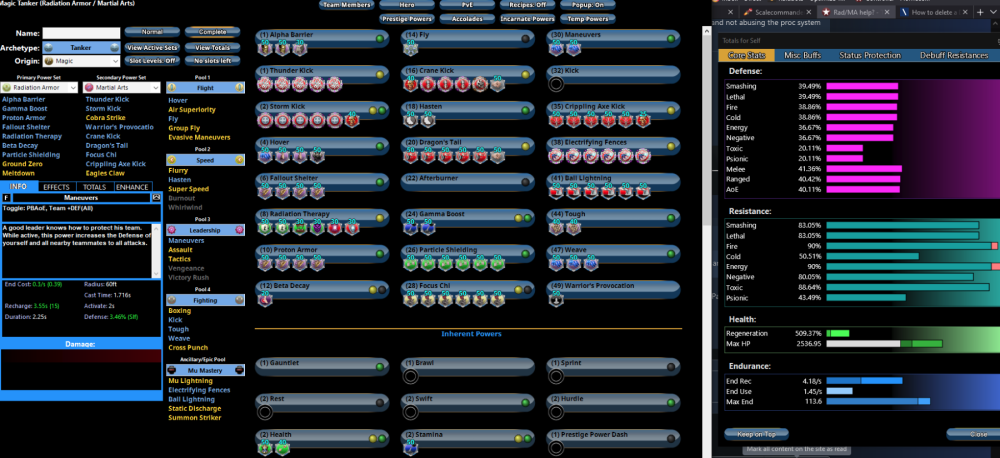 My mids spazzes when I try to export a file. I might need to rebuild old builds from scratch and see if it works but for what it's worth here's a screenshot. I can rebuild it if you'd like: It's a prehistoric build and I tweaked things a lot since it was a prototype for my Fire/MA that I ended up playing much longer and because of this refined it until I no longer needed Tough to be capped and still have the 45% to all. This one still has Tough toggled on (but not really a problem with how Rad sweats endurance) but has really dubious slotting looking back at it such as the -res in Beta Decay. The numbers are with one stack of the ATO and then a second for 90% to S/L/E and Barrier's 5% to finish capping negative and melee/ranged/aoe.