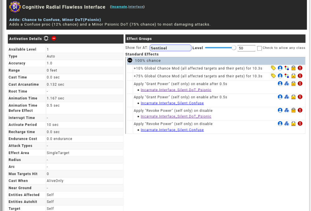 Cognitive Radial Flawless Interface is supposed to have a 12.5% chance to confuse but looking at the actual data on city of data, it's only 10%. Even the text says 12.5 same as the immobilize interface has. Is this a mistake or was it changed at some point? https://cod.uberguy.net/html/power.html?power=incarnate.interface.cognitive_radial_flawless_interface