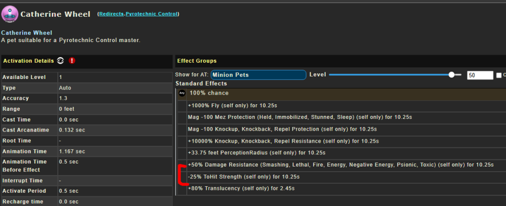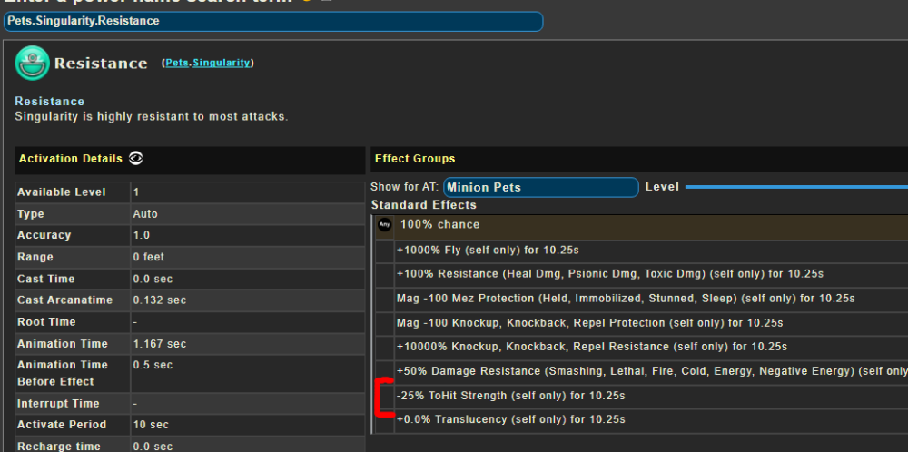 I have a question about the new pet Catherine Wheel and also the Singularity upon which it was apparently based. So, looking at City of Data raw info, it's clear that these two have extremely similar base settings. One thing that really stood out to me though was in the base power that contains all their default stuff like fly speed, resistances, etc. They both get, for some reason, a -25% ToHit debuff cast on themselves. This seems like a really weird thing to be on the base powers/settings for a pet, and I checked and none of the other similar pets have this -25% ToHit debuff on them. Can someone explain what this is and why it's there on just Catherine Wheel and Singularity? Was it a bug that was on Singularity and now just got copy-pasted to Catherine Wheel when they created it from the same cloth so to speak?