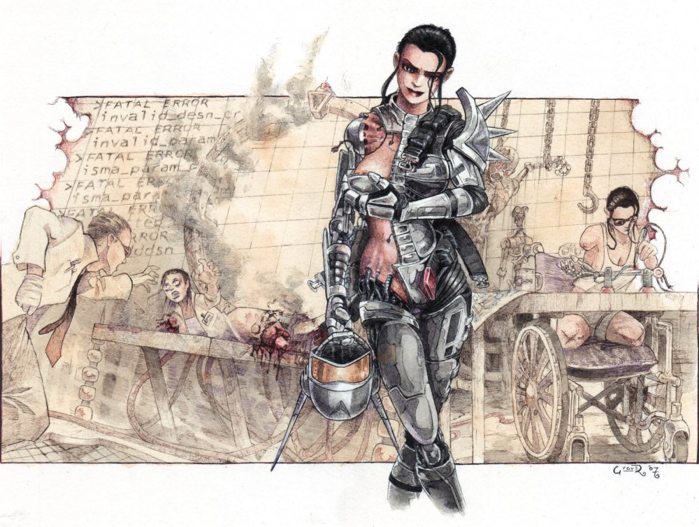 20. I'd like to repost a very old commission I got from the awesome Graver, back on Live. This is the 'origin piece' to my Mastermind, Dame Demolition. When we discussed the piece, I told Graver how she'd come about, the accident that resulted in dismemberment, and the process she underwent to rebuild herself after Crey denied her workman's comp claim. And he asked, "So which scene do you want illustrated, her as a villain, the accident, or the 'training montage' bit?" He'd sent me sketches to all three, and I said, well, um, could we do all three? two as a backdrop to the main piece? And this is the result: "Fatal Error" by Graver. I have the original, and it is one of my most treasured pieces of art.
