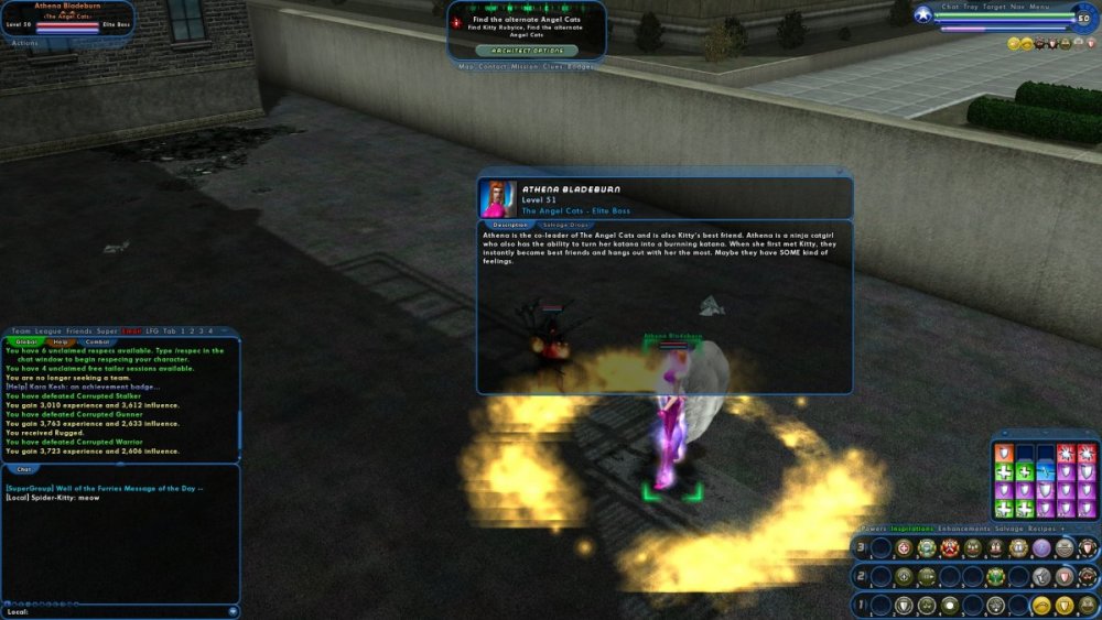 "Six of the eight emitters have been installed and tested." The Arachnos tech spoke slowly and carefully. "The remaining two will be fitted by tomorrow at the latest." He faced Black Scorpion, even though Ernesto wasn't really paying attention, eyeing a YouTube video playing on a small screen in his armor. Only the high ranking or the foolish spoke directly to the real leader of Arachnos. Lord Recluse reclined in his chair on a small dais at the end of the conference room, at the very top of the vast steel tower that dominated Grandville. Black Scorpion, Scirocco, Mako and Ghost Widow each had their own corner, several attendants surrounding each. Recluse himself was accompanied by three cats, one on his lap, the others lounging on cushions at his feet. Like their master, they stared intently at the empty air in the center of the chamber, favoring no one. Arbiter Fluffy, Arbiter Blacktail, and Arbiter Snuggles were the sleekest, shiniest cats in all of the Rogue Isles. They were also the most terrified. ----------------------------------- It had happened less than three years ago. Project DESTINY was nearing completion; spirits in the vast tower were unusually high. Lord Recluse strode from the command center to his study, gazed at the cats purring serenely along the periphery, then pulled the chair back from his desk. He scanned the piles of paperwork, his coffee mug off to the side... then paused. A glance at the carpet, deep blue pinstripe, then at the cats lounging on the couch, then back at the carpet. A dark oval stain, less than a foot in diameter. A faint smell of ammonia in the air. Recluse stared at the cats again, more intently. Fluffy slept contentedly, Blacktail looked back at him lazily... there. A tiny flash of guilt in Arbiter Fuzzypaws's eyes. Guilt and fear. Most cat owners would merely scold the offending feline; the harsher ones would turn it loose on the streets, a few of the truly heartless would donate it to a Tsoo restaurant. Not Lord Recluse. The ruler of the Rogue Isles held himself to a higher standard; he knew that the only true way to rule was by fear, and that fear must be absolute, with no exceptions for fur and tails. Each and every subject must know that to cross Lord Recluse would not end in imprisonment, torture, or even death; those were for lesser rulers. No, to fall beneath Lord Recluse's feet meant a fate worse than death; he would twist his former foes into a cruel mockery of their former lives, transformed into the very thing they despise. Gripped by the scruff of her neck, Recluse first took Fuzzypaws to Vernon von Grun, who injected her with a huge dose of growth serum derived from the Devouring Earth. Strapped to a bed and force-fed nutrients, she grew four feet in one agonizing week, muscles and tendons screaming in agony. Then, the cybernetic backpack was grafted to her spine, four metal claws fitted with blasters arching above her head. When she was barely able to walk, Fuzzypaws was drafted into the ranks of Arachnos's most feared soldiers, the Crab Spiders. Months of brutal training followed, forced marches, workouts, endless weapon drills, lectures on battlefield tactics and strategy. They final insult came upon graduation, when Fuzzypaws was denied entry into the Crab Spider corps, but instead was turned loose upon the pitiless streets of Mercy Island. Taking the name Spider-Kitty, she fell into the life of a two-bit villain, fighting the Infected, Longbow and other villains for discarded scraps of tuna and bits of string. But she persevered. In the months that followed, Spider-Kitty clawed her way up the ranks of Rogue Isle's villains, working schemes for Mr. Bocor and Peter Themari, then robbing banks in Paragon City, finally taking on odd jobs for Arachnos operatives like Viridian and Shadow Spider. When she reached the highest Security Level, Recluse himself tried to use her to complete Project DESTINY, but she broke away, defeating him in the future and bringing back his bloodstained helm. Recluse gazed at his former pet unflinchingly, an evil grin flowing like mercury. "And it is done." And it was. Beneath the scorching sky, at the feet of the vast statue in Grandville square, Spider-Kitty realized that Arbiter Fuzzypaws was truly gone. Less than a year ago, a fat, lazy bundle of fur had purred for table scraps; today, she was a tall, muscular figure without a speck of fat, scarred by countless battles, hard eyes scanning the concrete square for her next meal. And yet, there was no time to curl up and rest. Her phone rang with an urgent growl, a ringtone she reserved for contacts with potentially world-ending scenarios. Kitty listened for a minute, then hung up silently. After purchasing a handful of hotdogs from a terrified street vendor, she leapt into the air and was gone. Moonstar ULTIMATE: Part 2 1) Spider-Kitty has been contacted by Sonic, an old acquaintance from her garbage diving days back on Mercy. Except that this is Future Sonic... from the future. Celeste and Sparkle have brought back people to help them against Dr. Nova, but we now need to find and resurrect Negative Sonic, who is like Sonic, but negative. "Meow," Spider-Kitty replies, squaring her shoulders. We venture into some caves and rescue Xena the warrior princess, and also Katt Rubyice, winner of the COSMIC CLONE WAR. Then we scoop all of Sonic's body parts and glue them together with paste and chewing gum, and Negative Sonic is reborn! Except he won't help us and wants revenge. Oops. 2) Now we need to tunnel into Shadow's empire to capture Negative Sonic. We find the security system and encounter Tails... no, it's Evil Tails... no, it's Evil Tails FROM THE FUTURE! There's also a custom group called the "Corrupted", who have about half a dozen types with varied costumes and powers. There's also some IDF, which feels a bit odd. We destroy Shadow's ship (an Arachnos Flier, which gives Reward Merits when beaten) but Negative Sonic gets away. 3) Now there's a wor