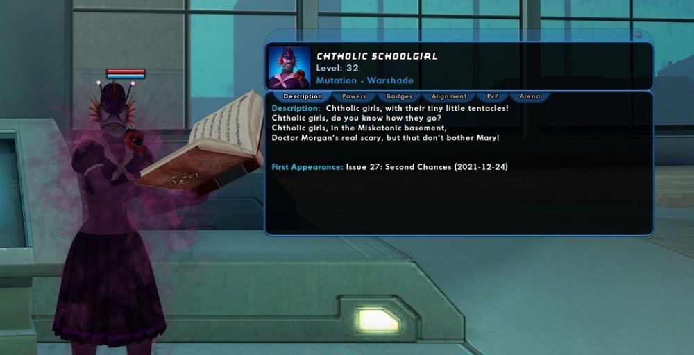 18. Insecurity Measures - 46658 The contact is "Dougie Hausser", the youngest cop on the PPD, who is written well, albeit annoyingly, although I suspect that was kinda the intent. Doogie tell us that the Red Caps' attempt on Salamanca has had some weird effects in IP, go check it out maybe? Kyksie decides to call in one of her acquaintances who has some experience with the occult. In other news, this is becoming less of a 'review column' and more of a 'place for me to show off my roster of fucked-up misfits'. Mary heads into a warehouse and finds Tsoo and Council working together... except they're not working together, they're being turned into 'vessels' or something. There are lots of decorative glowies here, which continues throughout the arc. Then, we discover that a cargo ship is going to crash into Lusca or something, so we head in, turn off the engines and fight some 'Spectral Tears'. They don't leave corpses behind, making it a difficult fight for a Warshade, but as the CoH veterans know, Warshades were designed for ERP, not fighting. Then another office, where we rescue Cheng, and Juliana Nehring, who attacks us because we didn't like and follow, or something. Then we need to bring in Mr. Bocor, so we take a sub to the Rogue Isles and find him hiding in a sewer. Once again, a very well written arc with great writing and decorations. I personally prefer self-contained arcs, so I probably won't be reviewing the 872 arcs to follow, but this looks like a great start.