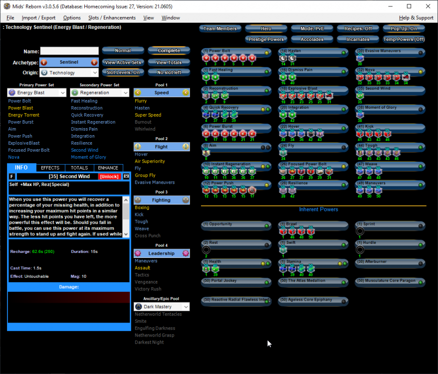 Gonna warn that I don't have any personal experience with Regen. You'll want to use Moment of Glory proactively rather than after you get in trouble, This Hero build was built using Mids Reborn 3.0.5.6 https://github.com/Reborn-Team/MidsReborn Click this DataLink to open the build! Level 50 Technology Sentinel Primary Power Set: Energy Blast Secondary Power Set: Regeneration Power Pool: Speed Power Pool: Flight Power Pool: Fighting Power Pool: Leadership Hero Profile: Level 1: Power Bolt -- SprSntWar-Acc/Dmg:50(A), SprSntWar-Dmg/Rchg:50(3), SprSntWar-Acc/Dmg/Rchg:50(3), SprSntWar-Acc/Dmg/EndRdx:50(5), SprSntWar-Acc/Dmg/EndRdx/Rchg:50(5), SprSntWar-Rchg/+Absorb:50(7) Level 1: Fast Healing -- Heal-I:50(A), Heal-I:50(9) Level 2: Reconstruction -- StdPrt-ResDam/Def+:30(A), NmnCnv-Heal:50(7), NmnCnv-Heal/EndRdx:50(9) Level 4: Quick Recovery -- PrfShf-End%:50(A), PrfShf-EndMod:50(37), PwrTrns-EndMod:50(37), PwrTrns-+Heal:50(39) Level 6: Power Burst -- SprOppStr-Acc/Dmg:50(A), SprOppStr-Dmg/Rchg:50(17), SprOppStr-Acc/Dmg/Rchg:50(19), SprOppStr-Acc/Dmg/EndRdx:50(19), SprOppStr-Acc/Dmg/EndRdx/Rchg:50(21), SprOppStr-Rchg/+Opportunity:50(21) Level 8: Aim -- GssSynFr--Build%:50(A) Level 10: Instant Regeneration -- Prv-Heal:50(A), Prv-Heal/EndRdx:50(11), Prv-EndRdx/Rchg:50(11), Prv-Heal/Rchg:50(36), Prv-Heal/Rchg/EndRdx:50(36), Prv-Absorb%:50(37) Level 12: Power Push -- Apc-Dmg/Rchg:50(A), Apc-Acc/Dmg/Rchg:50(13), Apc-Acc/Rchg:50(13), Apc-Dmg/EndRdx:50(15), Apc-Dam%:50(15), OvrFrc-Dam/KB:50(17) Level 14: Hasten -- RechRdx-I:50(A), RechRdx-I:50(31) Level 16: Dismiss Pain -- Heal-I:50(A), Heal-I:50(40) Level 18: Explosive Blast -- Rgn-Dmg:50(A), Rgn-Dmg/Rchg:50(23), Rgn-Acc/Dmg/Rchg:50(23), Rgn-Acc/Rchg:50(25), Rgn-Dmg/EndRdx:50(25), SuddAcc--KB/+KD:50(31) Level 20: Integration -- Heal-I:50(A), Heal-I:50(42) Level 22: Hover -- LucoftheG-Def/Rchg+:50(A), LucoftheG-Def:50(34), LucoftheG-Def/EndRdx:50(36), ShlWal-ResDam/Re TP:50(42), Rct-ResDam%:50(43) Level 24: Fly -- Flight-I:50(A) Level 26: Focused Power Bolt -- FrcFdb-Rechg%:50(A), Apc-Dmg:50(27), Thn-Acc/Dmg/EndRdx:50(27), GldJvl-Dam%:50(29), ExpStr-Dam%:20(29), Dcm-Build%:40(31) Level 28: Resilience -- ResDam-I:50(A), ResDam-I:50(42) Level 30: Evasive Maneuvers -- LucoftheG-Def/Rchg+:50(A) Level 32: Nova -- Arm-Dmg/Rchg:50(A), Arm-Dam%:50(33), Arm-Acc/Dmg/Rchg:50(33), Arm-Acc/Rchg:50(33), Arm-Dmg/EndRdx:50(34), SuddAcc--KB/+KD:50(34) Level 35: Second Wind -- NmnCnv-Heal/Rchg:50(A) Level 38: Moment of Glory -- LucoftheG-Def/Rchg+:50(A) Level 41: Kick -- KntCmb-Acc/Dmg:35(A), KntCmb-Dmg/EndRdx:35(43), KntCmb-Dmg/Rchg:35(43), KntCmb-Dmg/EndRdx/Rchg:35(46) Level 44: Tough -- GldArm-3defTpProc:30(A), UnbGrd-Max HP%:50(45), UnbGrd-ResDam:50(45), UnbGrd-ResDam/EndRdx:50(45), UnbGrd-ResDam/EndRdx/Rchg:50(46) Level 47: Weave -- LucoftheG-Def/Rchg+:50(A), LucoftheG-Def/EndRdx:50(48), LucoftheG-Def:50(48) Level 49: Maneuvers -- LucoftheG-Def/Rchg+:50(A), LucoftheG-Def:50(50), LucoftheG-Def/EndRdx:50(50) Level 1: Brawl -- KntCmb-Dmg/EndRdx/Rchg:35(A), KntCmb-Acc/Dmg:35(46), KntCmb-Dmg/EndRdx:35(48), KntCmb-Dmg/Rchg:35(50) Level 1: Opportunity Level 1: Sprint -- Empty(A) Level 2: Rest -- Empty(A) Level 1: Swift -- Flight-I:50(A) Level 1: Health -- Pnc-Heal/+End:50(A), Mrc-Rcvry+:40(39) Level 1: Hurdle -- Empty(A) Level 1: Stamina -- PrfShf-End%:50(A), PrfShf-EndMod:50(39), PwrTrns-+Heal:50(40), PwrTrns-EndMod:50(40) Level 30: Afterburner Level 50: Portal Jockey Level 50: The Atlas Medallion Level 50: Musculature Core Paragon Level 50: Reactive Radial Flawless Interface Level 50: Ageless Core Epiphany ------------ | Copy & Paste this data into Mids Reborn : Hero Designer to view the build | |-------------------------------------------------------------------| |MxDz;1427;714;1428;HEX;| |78DA4D934B6F125114C7EF30532BD0A7F45DFA025AA085A1531F89AF9868AB896D9| |3165A4D4C0CC1F64A513234C042962EFC026EBA71E3D28D1BFD04AE7DEEEA6B61DC| |F8AA6DEC435D8D67E6FC054886DF997BCFE37FCF9D337F67BAE9F1A5BBE784D2722| |19F2995D229699673A6CC7B96E4CA9A59C817B21561FF1AE9F1FFDF4C27336656AE| |EA33A62C662BE9F314591EA86E4ECB9BD22C493D29B3921C32E55CC1149E854221A| |FA7D6A55CF53AE6C57C2EBB566E66DB367366B6D5799B939955592CADE5D6FB66D6| |732B7A2D71A6783B3D4FB564B1D2437A46E9D90ED39F622BB41AC4734D084313AE1| |7E04BA6F60A7CCD3CF486998C5463151122186E71184CD19EC27B2EA59B8C018A5B| |56D86791B9443E2AFBA8EA86CBC919BAEF72F6423B9AC3B103AEF58B743608D6D9B| |0C96B6D6F9947DE81EF991D1FC08FCCDD30F79F6245E323AEB34CB5DD38B7FB8BEA| |D4F27C05BF3183DFC11FCCD016738FF27911EB8DB3DE261D4C305B264183D9F6497| |5EA064848337AD63CC1BD1A04AF90A656ECB5A28F61709F6AB6E3FCED539CB3EB28| |788CD9731C3CC11CFCCCE7BF4A797DC8EB43BE28E8263D9DBCA77576F2BD8C74308| |36DCCE82C6B1FDF657A29A61BFDEC0E729E03D2D78B9EF4DEE31EF7C55847DF43F6| |F1C738DE5FA1759F26061FD07A58134FA242F4435F7F0CFAC067E3F4E9A0D680A34| |F13BFA9D6107A3174926B0C9FE59AC3A7F07E9A397206442F9E52AD00F205527CBE| |6B119E057B6D14355C74C608AFA991054280CEBF082699F1145325DF09F470624A7| |5BEF5D85F3E6B6C8FBF99D83E33FE87A9518C8EF9D05133817E27D0FF76F29984CF| |247C0CEC19F0F56B023F4B15D01387DE04F41AD07B2B6ACFAB3D459635578BB35F2| |D4B2C6818665A519C952D4F75BE85C03D6F7BEA667E84CF38765971EEF167BDBF93| |61A7B6A20A4CF818263C8CC90E63D24557F5A6ADEB1467709C75A3CE9EF5D5ECCD3| |A7BC3B611FB0FC41CDB9B| |-------------------------------------------------------------------|