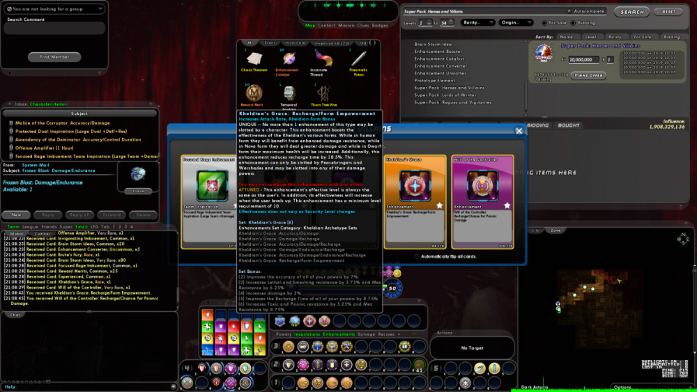 Decided to look at what the drop rates of the Winter, Hero, and Villain packs from the AH were on Pineapple and any Very Rare [purple] IO cards were not awarding IOs of the correct quality when claimed through the Character Item tab. All IOs were only Rare [orange] quality. As shown in attached images Rare Kheldian and VRare Controller IOs were in pack. Set bonuses of both IOs are of Rare quality [5 set: 8.75% recharge bonus compared with VRare value of 10%], which is correct for the Kheldian card but not for the Controller card.