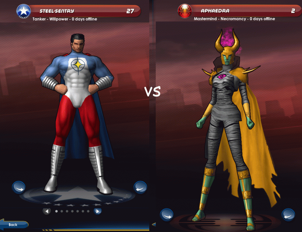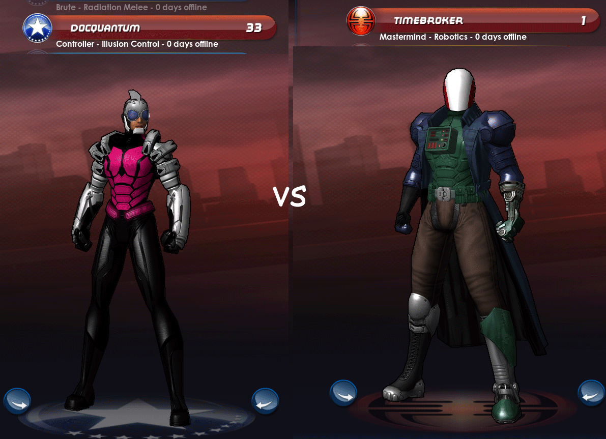 I've made almost exclusively heroes in my time playing CoX so I figured I'd try my hand at villains by making nemeses for my favorite characters. Guardian of primal magic vs ancient alchemist that left his humanity behind in the search for immortality by any and all means. Nerdy mortician turned super strong/invulnerable after an industrial accident vs deathless lich in want of a new world order Engineer colleagues work on a power armor together. They split when one decides to play it safe with a clean power supply and reactive interface, while the other opts for nuclear power and a fully integrated experimental AI. Quantum physicist invents a suit that can create rapid fire micro-wormholes simulating super speed and being in multiple places at once vs enigmatic time-traveling arms dealer. Uncannily evenly matched in intellect and battle tactics. . . High schooler and self-styled witch accidentally possessed by a simple-minded, immensely powerful demon vs unhinged Machiavellian angel looking to claim the demon's power for "the glory of God and mankind."