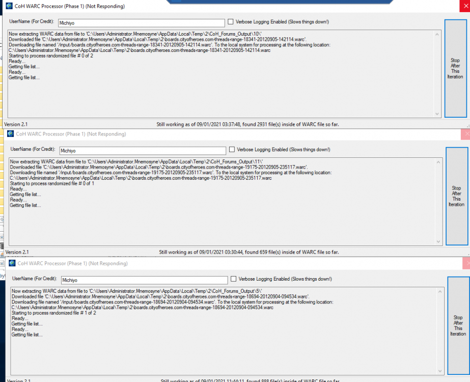There was an error in the application. Please copy and paste the following text in a message to the program author: System.Exception: Error while processing file 'boards.cityofheroes.com-threads-range-18341-20120905-142114.warc' ---> System.Exception: Failed to handle large WARC file ---> System.IO.FileNotFoundException: Could not find file 'C:\Users\Administrator.Mnemosyne\AppData\Local\Temp\2\boards.cityofheroes.com-threads-range-18341-20120905-142114.warc'. at System.IO.__Error.WinIOError(Int32 errorCode, String maybeFullPath) at System.IO.FileStream.Init(String path, FileMode mode, FileAccess access, Int32 rights, Boolean useRights, FileShare share, Int32 bufferSize, FileOptions options, SECURITY_ATTRIBUTES secAttrs, String msgPath, Boolean bFromProxy, Boolean useLongPath, Boolean checkHost) at System.IO.FileStream..ctor(String path, FileMode mode, FileAccess access, FileShare share, Int32 bufferSize, FileOptions options, String msgPath, Boolean bFromProxy, Boolean useLongPath, Boolean checkHost) at System.IO.StreamReader..ctor(String path, Encoding encoding, Boolean detectEncodingFromByteOrderMarks, Int32 bufferSize, Boolean checkHost) at System.IO.StreamReader..ctor(String path, Encoding encoding) at WHBennett.WarcExtractionRecord.StreamWARCFile(String sourceFileName, String outputDirectory, ToolStripStatusLabel& tssl) in C:\Projects\COH WARC Handler\WHB WARC Handler\WarcRecord.cs:line 45 --- End of inner exception stack trace --- at WHBennett.WarcExtractionRecord.StreamWARCFile(String sourceFileName, String outputDirectory, ToolStripStatusLabel& tssl) in C:\Projects\COH WARC Handler\WHB WARC Handler\WarcRecord.cs:line 261 at WHBennett.WarcExtractionRecord..ctor(String sourceFileName, String outputDirectory, ToolStripStatusLabel& tssl) in C:\Projects\COH WARC Handler\WHB WARC Handler\WarcRecord.cs:line 33 at COH_WARC_Processor.MainForm.BtnProcess_Click(Object sender, EventArgs e) in C:\Projects\COH WARC Handler\WHB WARC Processor\MainForm.cs:line 116 --- End of inner exception stack trace ---