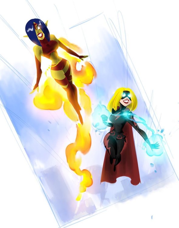 I happened to delve into my historical archives looking for a completely unrelated image and then this popped up. When I first began to play I met a guy who originally played with the Italian Posse on Defiant but soon became the core of our supergroup Shock Tactics. As we teamed I learned that he was an amazingly talented artist who created his own web comic with his then partner and he'd occasionally draw pics of our teams and SG members. I believe he's now in Canada working on various animated TV stuff. I'm claiming no credit for this - I think his global was @Zeltharis and this is his main, Corona, and (of course) Scarlet Shocker out to right wrongs. I just thought it was worth sharing. This would have been maybe 2007ish?