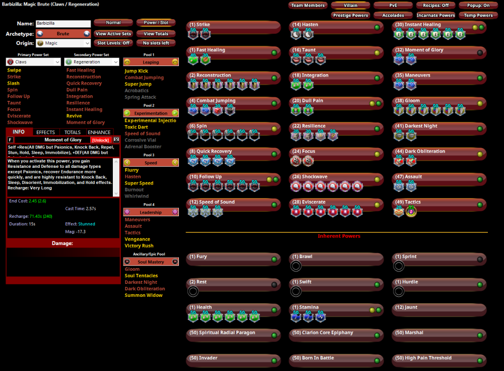 16. I started playing a Claws/Regen Brute; Barbizilla (you can check her origin elsewhere in the forums if you're that interested) - basically a concept character that I built and let languish but then suddenly realised I was enjoying playing. However, I rarely ever play melee characters and I have never to my recollection ever played a Regen character. It's fun (she's around 34 I think) but it's a lot more work than most toons I've played, even some of the more finicky Controllers/Dominators I've been reading some of @Spaghetti Betty's wise words here but I have seen a lot of stuff for the more advanced/experienced Regen brute, not the novice. The Claws element seems pretty straight-forward - punch something hard enough and stab/slash it at the same time. But Regen needs more input so where do I go with that? Also what APP/PPP works well? If you hadn't already guessed this is a "magical" blend of Barbie and Godzilla, two plastic kids toys smooshed into a living superbeing made of self-repairing polymer. I had thought Fire as an APP for thematic reasons but sadly I don't think fire breath is available. What pools are mandatory, advisable, preferred? Thanks in advance for input.