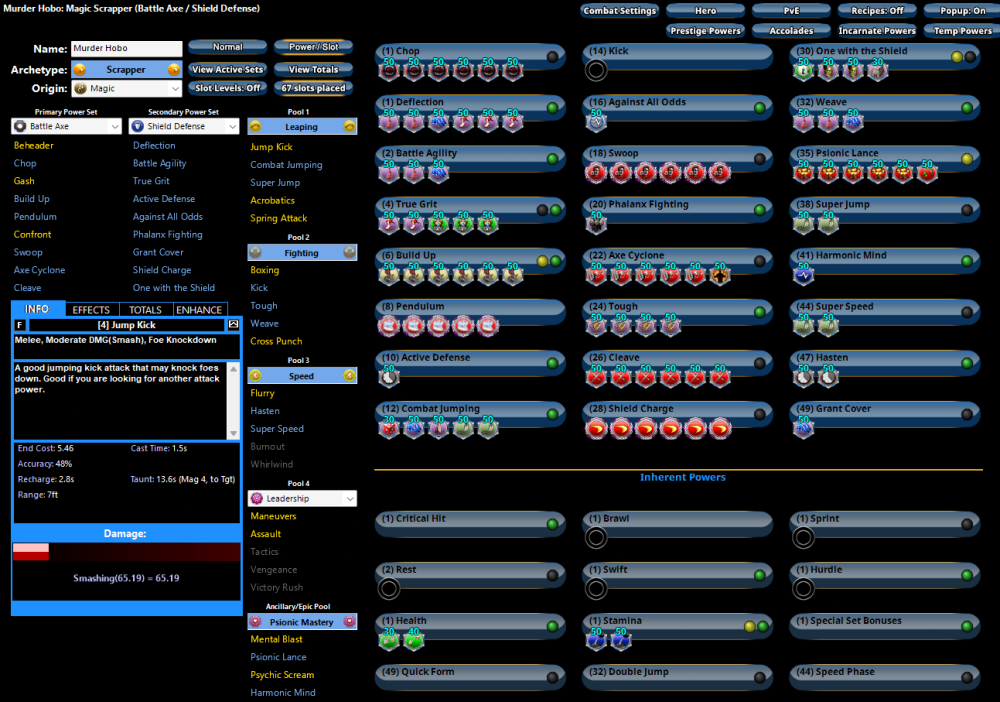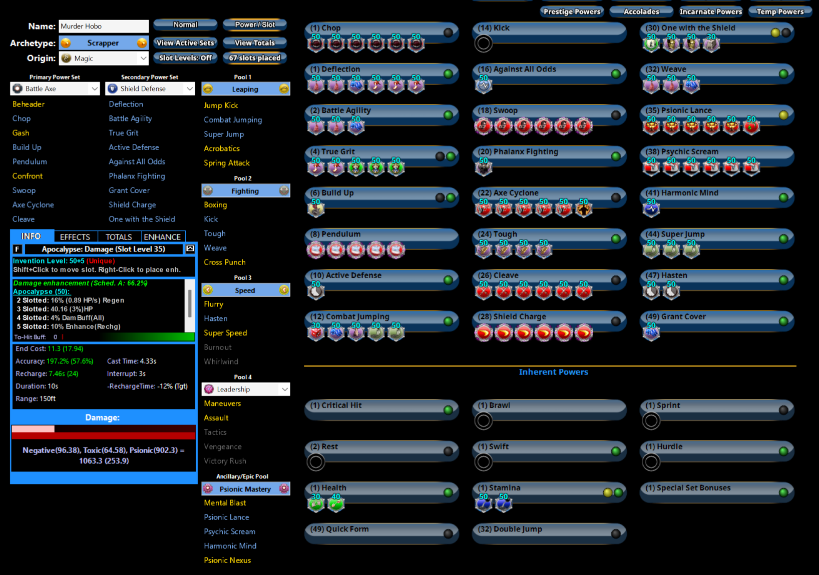I was looking to dust off an older BA/Shield toon of mine, but I knew it would need a respec so I was looking at what other's have done when I found this thread. This had a lot in common with the direction I was headed, so it gave me some good ideas to refine. However, as I was going I recalled one of my bigger challenges with this toon is that it is an endurance hog. With that in mind, here is my take on a BA/Shield that doesn't have Maneuvers, 45%+ positionals, and Harmonic Mind to help with Endurance a bit. Currently the build has Psychic Scream, but that is mostly for the last few Ranged Def. That power could be replaced with Gash (Mako set), Psionic Nexus (Expedient Reinforcement), or Mental Blast (Thunderstrike). I figured a ranged AoE (even a cone) added more than another single target ranged or melee. In all honesty, this is one area where I'm definitely interested in other's ideas. If there are any tweaks or holes or suggestions, I'm all ears. I look forward to any input. Thanks! |MBD;24700;1519;2028;BASE64;| |G3tgACwK7AbtDp2wpQV85yzhX5ciXXumW6j89NwmTHu9Ahn8E+7JJ3MTfrpcqHx01yM| |JQFF6Sn6z6HT19af6VdWurD5NuUUzuhoR+02MjoAFePbvR2uvNjIyMlLthpWOzN/bnR| |QYJOEErle+OLItK0BPJEydQS3+rNo3KheXGgfsXesiazHaGgMrOWNAWKL8WLiKRa5S0| |fNbH1urhSEj3xbMuLoB5de08LpzmdeAekgrWjCKtwQ+jT3R9cX5gHfJShyqIdXUzvcC| |XPei1u2HknrwWogGvSk5OrvyJb1B9bOsSZJ7010Q3sDv1R518I6BeKt+TghCZJcWHk+| |4kqMeqGz9vcO+NKDA0R17M9kn2PQgXfY+NAU6tBY1r7ir69HBy7R+TpWxSGX1tEiDVc| |p6aQMu6cdMcZNO/S/N+jL1jEcncrsOOmfR3txSmyB0J1bbzlozmHxwJtrnwPTV7HpPH| |iqunq0WtnzWtczwrk1V3TJf+5xWHM0mAlYPP7nxX2Jsx9I+ya0IHsbZcgJLWr7U7CYc| |ZusBzH9Ub/rZMlpA8LMwaPB/T3IpkDX49VzsCIebWtz81bfkHlX4gvZR4AvWoA5deM+| |P/A9SZS2M915R0WXduT1Xrmre+d7lhWOP6rUNe8ZzaAPgAekF7BVeQBsCj0gvYW+STb| |io4YK/8eVhUa7Qc9bRDyFpHa+wKRCKw376ur7X06O2IZzIa9/cZRRIGYkwvK6pgUsFN| |f7nn1zh+1QEJfUp1yXFJvsmOJfY5TqGmzyo67DBepZ5tduzNNHO5B2uoKgwgbJUBVhK| |opt27YmuoBJSS9hMVqqbgtr2aEfin7PJxh1sySUtXyUJuXH8/vOashaMQ2nnN8E2DPe| |jC+9MYUvSlw1gO+M7NFktgdzeiNh6NxM2tu4b9sHQo9bUzyCr2oZB9mLldQE5fYX4v+| |EXaSvrgAHsW9mAMsyDIRFy3UtU6mtWSij7POehfOmcvMhy3xKggw74fXJRg3+/JKMJT| |u6da6rb/pG8Uc43Kfk4Ackm2bxHL3AOKFAeDM9RrsgUu2z7D/iLNb+CjDqYi+S+BcMz| |ju5VuICQm3g+GyoyV90EQKEi2/3pp0rnGLm20vbLcO+gjR0PmUOd0UgJjPKnEUbrw4v| |/5R5Ko+rVpN5yZtMwfXLE0fgzjaG8Q3kAJpCeoTsRnVLro+ZkZfukkJyX5QCHOsehgv| |k+JTdrftZB95RQsUuD2zKegi3aGdZfkMXNF8Zwk+3lmS4MYC+VDChJwCQM99bc8ZXk3| |1V5CJevBSfqrrh8X1M1SG6gYDgXbqtz7uh8RqhsjlFgR8ytr7oOOV5v2NOs1WDEYSYa| |hHA/iNtRBsM9NVKX8N49KRAvyZmoLZ61rg4YwProGlCViE36k7T8KPT8JDc3z77I+LN| |zL2ie3hpDeUB3h5zZ+MuY6U5EZ7bhNFBr2Swl6aczudraETgIScB1sSN8JwtXrEwDCs| |hB12awFPyMzIOogkeakxO3LEE2bVhvoQKPJ2dRC/zBy/eyZdv5s01OcSfbqmvNANwiQ| |qRb6Ms3JUJcM4y+eRrSag4Vf8zV/r938oz+Yty/ABcM16/clnfWr5WNh4p/f/4515kL| |5KRQYSGJAfYKNaBKAJVQhUBNJJYw3ENVdRn/hAZbSfdAwNX01afTHgm+98APht98zcU| |kMmgUr6wmq6IDBrD1VAxoSERHbrkRJP30EWJjV90kujhJA19KbxDjhpnMVtxSgRP6Zv| |OHqlZAPnUsiA3edd+Cox5ONJcMPMCadnJinAHRjVDfF9nAyDNpmF++Bl5HofPmghHxu| |ced3urgk7lKdQ2Wl/GVHvyhVAWXH5XL5lx5jf0VSivESo1cyBWwkKoQ/m2nm/Uhzwj2| |zFf87itT3TEUc/+tESOJ/oOx/yzHvsU4CW4vViSsg7LNehfTd2BIcFeutp3foy8otsV| |YOwPeWfxM+oYHOKhLQOfiucuPgYV+6//JkVDkbjuREbGPJDmLZLIQLSd28hn7b+XZX+| |bIBGDtGasq/ogFOw==|