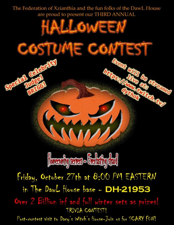The Federation of Xzianthia supergroup and The DawL House discord are holding their THIRD ANNUAL Halloween Costume Contest! It will be held the Coliseum in the center of the DawL House base on Everlasting, starting at 8PM Eastern. There will be Trivia with prizes! The categories this year are: Arcane Magic Mad Science Horrifying Nightmare Vile Demon There is a growing prize pool of over TEN BILLION in inf, along with full Winter sets to be awarded to the top winners! 1st place (in each category) will win 1.25 BILLION and a full set of Winter IOs of their choosing 2nd place (in each category will win 750 million and a full set of Winter IOs of their choosing 3rd place (in each category) will win 500 million and three super packs! The DawL House base passcode is: DH-21953 After the contest is over, and prizes have been awarded, we plan to visit Dacy's "The Witch's House" for some more spooky fun!