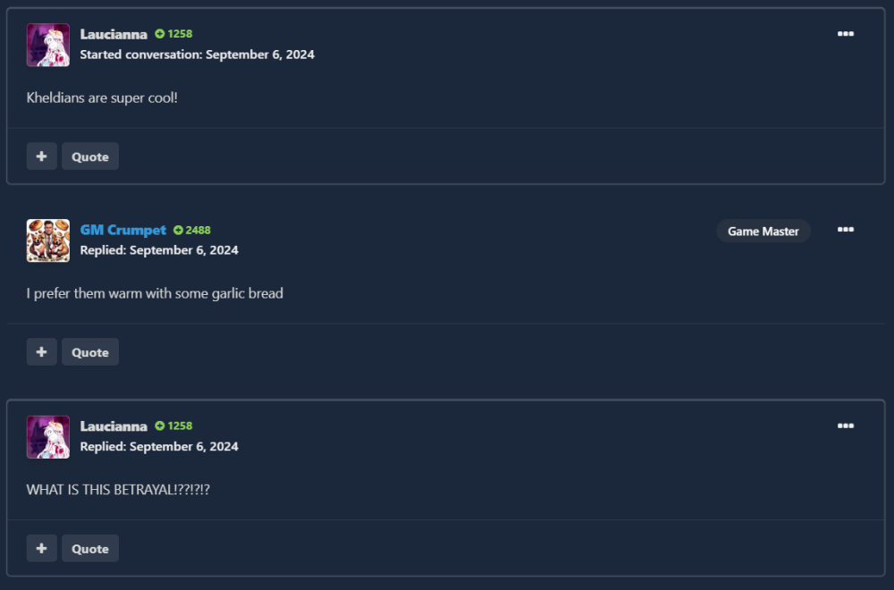 I wouldn't want the results publicly posted anywhere as that is just a shaming board which doesn't help anything. To me and this is just my opinion which could very much be wrong but this is how those situations would go: 1 - Complaint disregarded - Complainer understands what happened isn't an issue to the GMs and can make a decision if they still wish to play depending on what it is they complained about. Aggressor has no idea anything has happened and continues on complying with the GMs verdict without even knowing. 2 - Temp ban - Complainer is informed a temporary ban has been given and to let them know if it repeats when they get back, making the complainer feel seen and safe. Aggressor gets a temp ban due to X reason and can either decide to leave the game or stop doing X, or continuing doing X until perma ban. This has the added bonus of others who have been victim to the Aggressor but didn't feel confident reporting, to have to not worry anymore without having to do anything. 3 - Perma ban - Complainer is informed and to let them know if the person returns on an alt account and the team will handle it, making them feel safe and seen. Aggressor gets a ban and can decide to move on with their life or try to evade it and catching more bans. This has the added bonus of others who have been victim to the Aggressor but didn't feel confident reporting, to have to not worry anymore without having to do anything. Whatever the HC team decide to do in the future is fully up to them and I will still play the game as long as I am not feeling too uncomfortable because of others, I am just making a suggestion that might help players who are victims feel a bit more seen and understood when they do complain. Also just to make sure this is clear I do love and adore the HC team, they are far from perfect as most of them eat Kheldians, but they are amazing people doing an amazing job keeping a game we all love running and super populated with content 💛 -