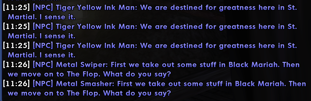 I was in the eastern Jackpot neighborhood during a Banner event, and noticed some NPCs were repeating dialogue, like this: For context: that Tiger Yellow Ink Man said that to an associate (and I believe the associate said the same thing), but then when I moved in to attack them, they repeated the phrase like it was a bit of attack dialogue. For the two Freakshow a minute later, one said the line first, and then the other said it to the first one in response to it. I ran around for a bit since I was trying to find Ancestor Spirits to kill (as one does), and noticed more repeated dialogue here and there, though I couldn't get it to trigger consistently. Though admittedly I didn't try long, I only needed to kill three Ancestor Spirits after all, for reasons that are definitely clear beyond any need for explaining.