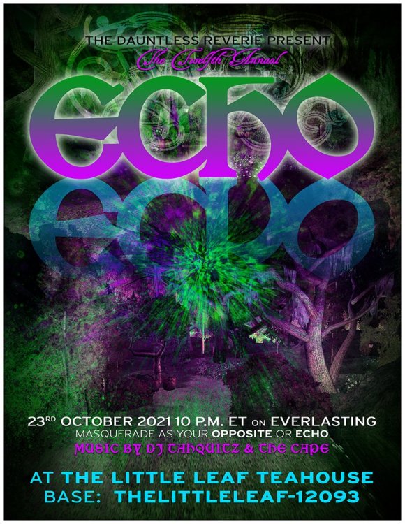 A FLYER has been found posted on light posts, trees, building walls, and business bulletin boards throughout Paragon City./color] An accompanying card, black with silver and gold finely printed text, is found in a holder close to the Flyer. Heroes also may have received the card in the mail. The text of the card is below. ((OOC Info!!!)) What: The Dauntless Reverie's 12th Annual ECHO When: Saturday, October 23rd, 7pm Pacific / 10 PM Eastern Where: The Autumnally Festive “Little Leaf Teahouse” (Basecode: thelittleleaf-12093 ) Who: All RP’ers on Everlasting! Music: DJ Tahquitz, Cape Radio Questions? Contact: Nyghtshade (@Nyghtshade ), or Spike Strip ( @Kitteh Nova )