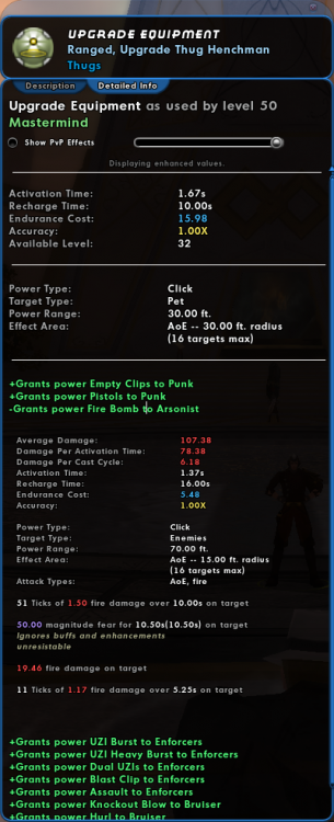Except it does, it's specifically on the 32 upgrade power, but it is DEFINITELY there. and very noticeable where it is not there before you hit level 32. It is much exacerbated by the change last year where DOT effects were given a general "ai fear" which is also part of the problem that i wish they would address. It makes sense for burn patches somewhat, but DOT in general should really not do this. It is not a "L2P" issue. I have more than enough vast experience in the matters, but I also believe you shouldn't be forced to have to take an aoe immobilize. I really do like the MM AT, but that is not to say that it doesn't have more than it's fair share of issues, like the -2 minnions especially in late game scaled up content and upgrade powers needing to be auto (which i feel you'd be one of the people to say it's fine as is i'm sure...) This is one example though, where i agree thugs is fine OTHERWISE but ends up being really detrimental to the whole set overall having them spread out because of something you can't control, outside of literally making the arsonist not attack (or forcibly making him skip his most damaging attack too which defeats the purpose).