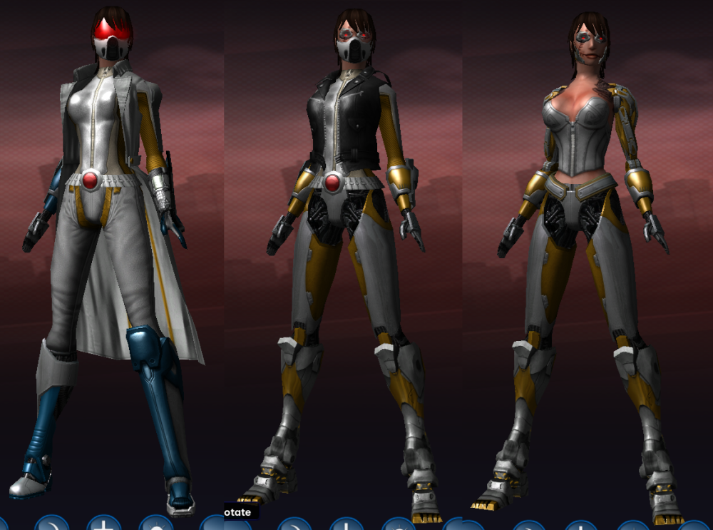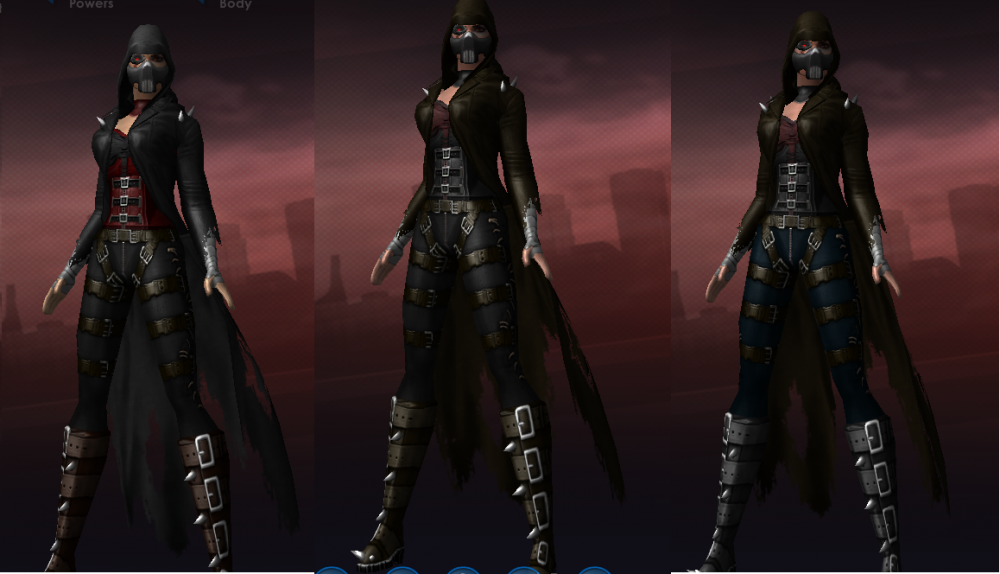 Hey Costume Creators, dropping in to ask for some help/brainstorming to update one of my characters. The short story is Death Glare started as a Syndicate Suit, but after being betrayed and nearly killed was made into a clockwork cyborg and joined Powers. Then later Powers betrayed her too, and now shes forced to go rogue, staying morally gray but still more of an anti-hero than amoral rogue or villain. The three keywords in my head for her are Terminator, Yakuza/Syndicate, and Anti-Hero. If anyone has any ideas or wants to play around with the costume feel free! In terms of her parts, basically shes meant to be more machine than woman at this point. I posted her Starter costume, Current Costume, and how she looks without the mask/top.