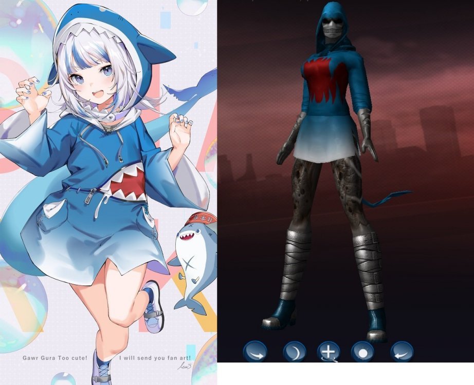 I am attempting to do something terrible and meme-y, and make a gura chan outfit for my shark girl. This is where im at, if anyone has a better idea on how to try and replicate the look, I'd appreciate it as this idea makes me laugh hysterically.