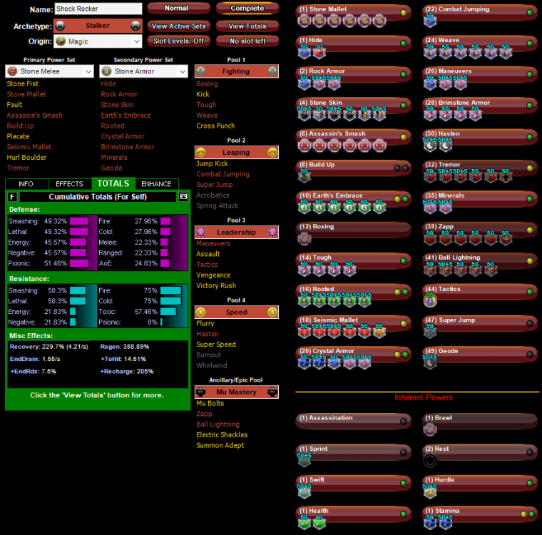 I built this for you. I think you might like it, softcap to S/L/E/N/P while resistance capped for F/C. Capped HP, decent net recovery (+2.53 end/sec), 389% regen (34 HPS), and a ton of global recharge (205%). You'll have a lot of ST burst damage with AS > Seismic > Zapp > Stone Mallet. I chose Mallet over Fist because it gives 90% chance for Assassins Focus instead of 70%, but feel free to go with Stone Fist if you just want a filler. There's enough recharge where Stone Mallet doesn't have to be required.