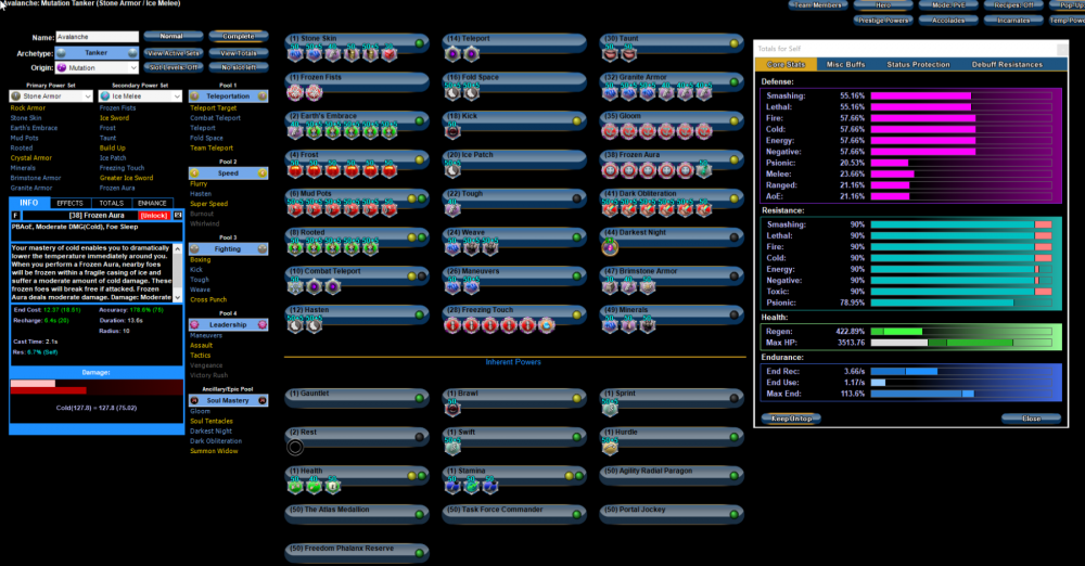 This build isn't exemplar friendly (Frost and Mudpots is about it until Freezing Touch). But it is beefy. With 3 stacks of Might of the Tanker, you can hit 90% Psi Resistance (Frozen Aura is auto-hit, so your success rate with the res and heal proc are that much stronger). Also, Freezing Touch is set up with two Absorb Procs which can be handy. The image below is with accolades on, but no incarnates selected.