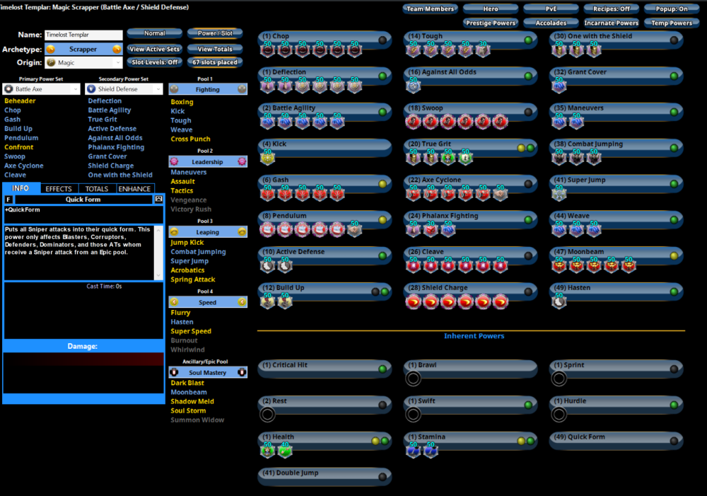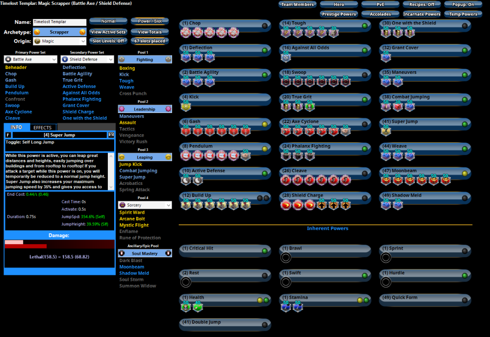 I appreciate the time you took to look over this build! I've made some adjustments based on your feedback. Timelost Templar - Hero Scrapper Build plan made with Mids' Reborn v3.7.5 rev. 21 ────────────────────────────── Primary powerset: Battle AxeSecondary powerset: Shield DefensePool powerset (#1): FightingPool powerset (#2): LeadershipPool powerset (#3): LeapingPool powerset (#4): SpeedEpic powerset: Soul Mastery ────────────────────────────── Powers taken: Level 1: Chop A: Mako's Bite: Accuracy/Damage3: Mako's Bite: Damage/Endurance3: Mako's Bite: Damage/Recharge5: Mako's Bite: Accuracy/Endurance/Recharge5: Mako's Bite: Accuracy/Damage/Endurance/Recharge50: Mako's Bite: Chance of Damage(Lethal) Level 1: Deflection A: Reactive Defenses: Defense/Endurance7: Reactive Defenses: Defense7: Aegis: Resistance/Endurance/Recharge43: Aegis: Psionic/Status Resistance45: Aegis: Resistance/Endurance46: Aegis: Resistance Level 2: Battle Agility A: Luck of the Gambler: Defense/Increased Global Recharge Speed9: Luck of the Gambler: Defense9: Luck of the Gambler: Defense/Endurance46: Luck of the Gambler: Endurance/Recharge50: Luck of the Gambler: Defense/Endurance/Recharge Level 4: Kick A: Invention: Accuracy Level 6: Gash A: Hecatomb: Damage/Recharge11: Hecatomb: Damage/Recharge/Accuracy11: Hecatomb: Recharge/Accuracy27: Hecatomb: Damage/Endurance39: Hecatomb: Chance of Damage(Negative) Level 8: Pendulum A: Superior Avalanche: Accuracy/Damage13: Superior Avalanche: Damage/Endurance13: Superior Avalanche: Accuracy/Damage/Endurance15: Superior Avalanche: Accuracy/Damage/Recharge15: Superior Avalanche: Accuracy/Damage/Endurance/Recharge40: Force Feedback: Chance for +Recharge Level 10: Active Defense A: Invention: Recharge Reduction17: Invention: Recharge Reduction Level 12: Build Up A: Gaussian's Synchronized Fire-Control: Chance for Build Up40: Gaussian's Synchronized Fire-Control: To Hit Buff/Recharge Level 14: Tough A: Unbreakable Guard: Resistance17: Unbreakable Guard: Resistance/Endurance19: Unbreakable Guard: RechargeTime/Resistance19: Unbreakable Guard: +Max HP21: Steadfast Protection: Resistance/+Def 3% Level 16: Against All Odds A: Invention: Endurance Reduction Level 18: Swoop A: Superior Critical Strikes: Accuracy/Damage23: Superior Critical Strikes: Damage/RechargeTime23: Superior Critical Strikes: Accuracy/Damage/RechargeTime25: Superior Critical Strikes: Damage/Endurance/RechargeTime25: Superior Critical Strikes: RechargeTime/+50% Crit Proc43: Superior Critical Strikes: Accuracy/Damage/Endurance/RechargeTime Level 20: True Grit A: Gladiator's Armor: Resistance21: Gladiator's Armor: Recharge/Resist27: Panacea: Heal46: Preventive Medicine: Chance for +Absorb Level 22: Axe Cyclone A: Armageddon: Damage/Recharge29: Armageddon: Damage/Recharge/Accuracy31: Armageddon: Recharge/Accuracy31: Armageddon: Damage/Endurance31: Armageddon: Chance for Fire Damage42: Force Feedback: Chance for +Recharge Level 24: Phalanx Fighting A: Reactive Defenses: Scaling Resist Damage33: Kismet: Accuracy +6%33: Luck of the Gambler: Defense/Increased Global Recharge Speed Level 26: Cleave A: Obliteration: Accuracy/Recharge33: Obliteration: Damage34: Obliteration: Damage/Recharge34: Obliteration: Accuracy/Damage/Recharge34: Obliteration: Accuracy/Damage/Endurance/Recharge42: Obliteration: Chance for Smashing Damage Level 28: Shield Charge A: Superior Scrapper's Strike: Damage/Recharge29: Superior Scrapper's Strike: Accuracy/Damage/Recharge36: Superior Scrapper's Strike: Damage/Endurance/Recharge36: Superior Scrapper's Strike: Accuracy/Damage36: Superior Scrapper's Strike: Recharge/Critical Hit Bonus43: Superior Scrapper's Strike: Accuracy/Damage/Endurance/Recharge Level 30: One with the Shield A: Gladiator's Armor: Recharge/Resist37: Gladiator's Armor: Resistance37: Gladiator's Armor: TP Protection +3% Def (All) Level 32: Grant Cover A: Luck of the Gambler: Defense/Increased Global Recharge Speed Level 35: Maneuvers A: Luck of the Gambler: Defense/Increased Global Recharge Speed42: Luck of the Gambler: Defense/Endurance Level 38: Combat Jumping A: Shield Wall: +Res (Teleportation), +5% Res (All)39: Shield Wall: Defense39: Shield Wall: Defense/Endurance Level 41: Super Jump A: Winter's Gift: Slow Resistance (20%) Level 44: Weave A: Luck of the Gambler: Defense/Increased Global Recharge Speed45: Luck of the Gambler: Defense45: Luck of the Gambler: Defense/Endurance Level 47: Moonbeam A: Apocalypse: Damage48: Apocalypse: Chance of Damage(Negative)48: Apocalypse: Damage/Recharge/Accuracy48: Apocalypse: Damage/Endurance50: Apocalypse: Recharge/Accuracy Level 49: Hasten A: Invention: Recharge Reduction ────────────────────────────── Inherents: Level 1: Critical Hit Level 1: Brawl (Empty) Level 1: Sprint (Empty) Level 2: Rest (Empty) Level 1: Swift (Empty) Level 1: Hurdle (Empty) Level 1: Health A: Panacea: +Hit Points/Endurance37: Miracle: +Recovery Level 1: Stamina A: Performance Shifter: Chance for +End40: Performance Shifter: EndMod Level 49: Quick Form Level 41: Double Jump |MBD;25011;1492;1992;BASE64;| |G7JhAKyKx/lXLKSkJLigx4yXS5GuPUsnU34aB8Lc39+1hZQ1e5ZphCchWbr6WocFpKv| |TVimP3kxaoJ/Sp+T5Uyu/6snVuSlTNNGvETN+O0YfHwK8m9PvW9bsGnnOBuh2NxaJsV| |vdPYScZIq1qefUzkNdcKiYdYrC4FTSYmtU/4LsEBIcnALvTgIhMrXrcNckKchLwUYWt| |P9LZlhEf1SIZ/vDWgRTa7ztQCTXUZD5FQT3N68eE2CItJogLj4V+GnsB8kZ59F818Jg| |hlSjPY8DlO6l5OsHcp0ua8EpeFMicfaWS08K5mebO0Yucy/4pFD3FkPCkpYlm7zFJnM| |ImqQe1mw3FBWyFdtOfhZzME8YUHyy9zE+wU4PKubAUk1hddJSao7rpxUTrPyZWV/x++| |HrTM58qz6hT0tPKjSr4WzdN5c9Me3+ooPVl/Nrtw5H9uBNrP4494k+4m3G5aDCNhcl9| |f75qZR0bLWEVKzzWT7Pybmlm6u0zyDxGaPBMfKjSm75F6iP49U+hFsdnI1LywVYPmJW| |80g3zOMAzGfS6/6dWgnocktUnvJ/BocmGAR/nYvd8J4jLBtz7tt9Hwu+vFCRBdx6CiZ| |0YZlv+Ac2XQt12aTnVvyR1p50DFCIvdIxgRHlRUjbzO6eK6uOFOvc4qcunxRPeZFAFf| |E89oBEBydUQ+kjtGLg5wEujdcRsSSFMVYKBlhpZaS56l/PtaYZ01q