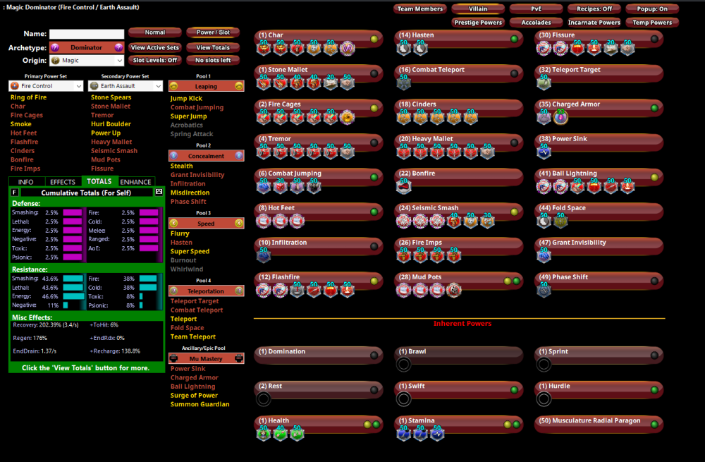 19. That's more or less what I suspected - thank you for sharing your experience, @Caimie! I wonder what an optimal swap might be. Considerations include: Power Up. No useful secondary effects to boost, but the damage is at least something. On occasion, the extra duration beyond what dom already provides may be useful. Stealth for an extra lotg mule. I probably won't bother running it for the defense. Smoke. -perception can be handy at times. The -tohit isn't much to consider. Misdirection. A decent little aoe resist debuff! Pretty long cooldown though, especially considering I won't have slots to devote. The placate effect might come in handy as an extra pause here and there. Surge of Power. Not super thematic for this guy, but another emergency button might be nice. Could mule Steadfast +def here for kicks. I could always keep it of course. I'll test it for a while and see how much it comes in handy. Actually, I think an epic swap may indeed be the way to go! 2 end/sec + perf shifter, panacea procs, and dom injections should be reasonably sustainable without the extra crutch of power sink. I jimmied up a Fire APP version for comparison here: Dominator (Fire Control - Earth Assault) fire version.mbd The main downside here is that the resist profile isn't as desirable. However, I get more damage, a handy self-rez, a mule for the PM proc, and a debuff I'll actually use in Melt armor. The whole thing is more on theme as well.