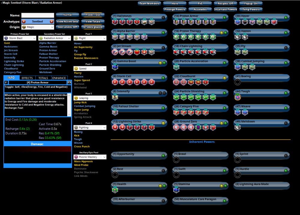 Hello again, Sentinel land! I've been away for some time, and am pleased to see some nice improvements to the AT. I'm itching to try my hand at Storm blast as well. The busy nature of the set looks to lend itself pretty well to Sentinels, so here I am. I understand Storm has its detractors, being seen as a bit end hungry, and lacking many of the valuable proc optimization possibilities that help other primaries compete in damage. I'd like to make the best of it either way! I'd love to hear of anything you see that I may have missed in pursuit of the build's goals: Ranged defense focus, with the goal of being within small purple of soft cap. Any easy extra bonuses I can pile on here would be great, and if you see a clear path to soft cap without sacrifice, all the better. Shoring up resists across the board. I do plan on keeping Meltdown on healthy rotation when needed. Secondary focus on recharge so I can keep a full rotation within storm powers alone (no epic attacks). For the few powers that take procs decently, optimize for damage in this way. I love slow resist. Thank you /Rad, you make this easier to cap! Max hit chance against +3's. Concerns: It looks like I have plenty of end to cover the thirst - do you think I'm still short? I am keeping Jet Stream without KD conversion. The plan is to actually use it as a soft control, FFback enabler, and KD when I actually have storm cell up. Do you enjoy this power without KD conversion? Overall survivability. Between the heals, solid resists, and layer of ranged defense while keeping distance with jousting/Jet stream, I think I can hack survival while solo. What is your experience with /Rad? Does it really ask for any pieces I am missing here? Build: Note that I have procs disabled in view for hailstones and jet stream to avoid FFback reporting on totals, so to view actual damage will need to toggle these on. Edit: Added build file directly. Sentinel (Storm Blast - Radiation Armor).mbd Visual: Sentinel (Storm Blast - Radiation Armor).mbd