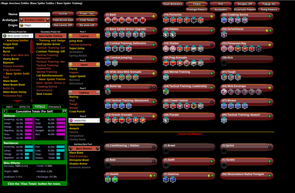 Thanks for taking a look, folks! @tidge The 4th lotgs for both powers are there for the Global accuracy. I have leaned into procs here, and these bonuses keep me at max hit chance against +3's on all powers. If you see a more efficient path to maintain accuracy without losing damage, I'm very open to further optimization! If I'm going to overslot something in pursuit of accuracy bonuses, doing so in my highest return defensive powers gets me that much closer to my softcap goals as well. Speaking of which, placate is already at max hit chance even as is. Although there are some nice sets for threat/placate, they don't serve any specific goals in this build, and the recharge/acc are sufficient with the one slot. I would have to tank my global acc or sacrifice procs to invest the slots. To @Maelwys, Shatter Armor is a nice power, but what would you drop, and where would the slots come from? The slots in the maneuvers and weave are serving global accuracy needs to enable procs, and I also rely on the melee defense bonus in unbreakable from the T1 armor to softcap melee. Even then, every other attack power is already 6 slotted and maximized for procs - do you see any missed targets where I didn't optimize for procs with this slotting? I'd love to find a spot for the PM proc, as I agree it's very effective but don't see any easy flex slots to pull from. My latest iteration does not include damage procs in Surveillance, and I've made further adjustments to balance the return on procs between shatter/pulverize. Build: Arachnos Soldier (Bane Spider Soldier - Bane Spider Training) less sl.mbd Text: Picture: -
