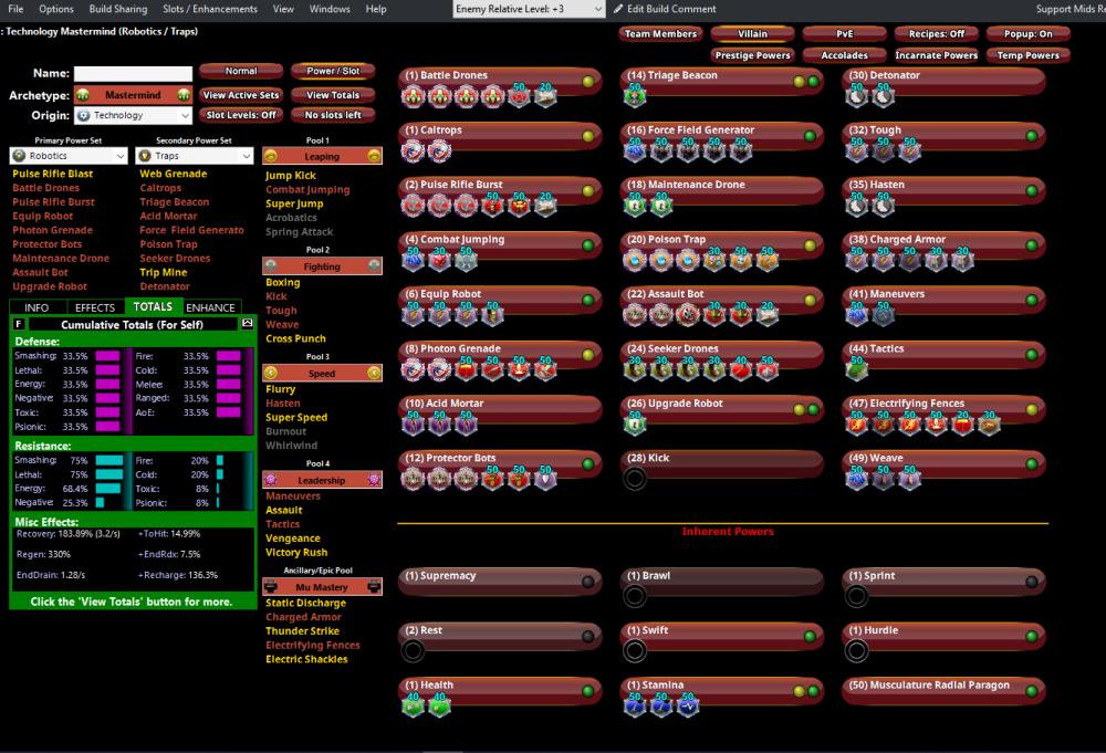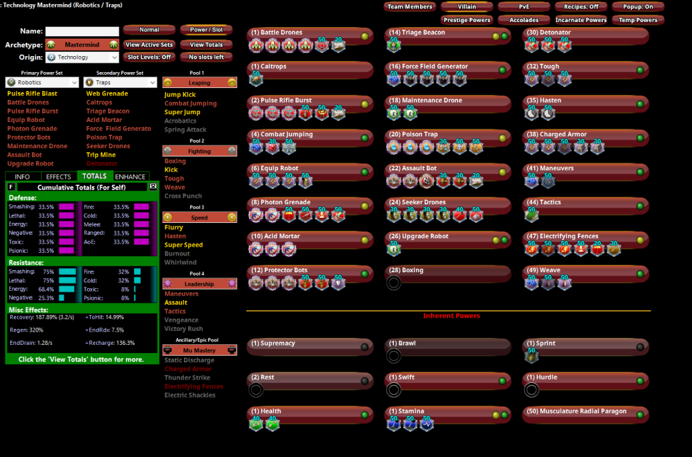 I keep fiddling with this build and finding little optimizations. Found some more slow resist and F/C resist without sacrificing anything. Decided the 40% chance to stun is good enough in Fences - the 2 PPM from energy manip just isn't worth it vs a damage proc. I know Detonator doesn't benefit from actual damage/acc slotting, but here I was able to mule out some good bonuses from Ragnarok for only 1 more slot invested and keep recharged maxed. One step closer to perfection! Build: Mastermind (Robotics - Traps) mu version.mbd Picture: (add 15 defense for the buff from bots). Text: