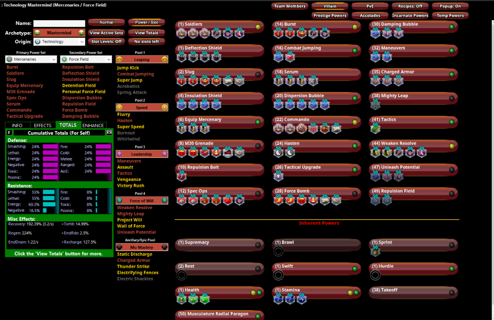 I'm going manic on CoH this holiday season, and my last build (bots/traps) is all polished and running well. Great fun if you haven't tried it! The stunny bunny is a beast. On my bots, I leaned into the stunny fun. Here I'm doubling down on knockback as a mitigation strategy. I haven't played FF in a while on any character, and I have a fun theme for this combo, so Mercs/FF it is! I know there are more meta/powerful combinations (Mercs/Marine looks amazing), but this has some good synergy, and FF got a nice facelift in the not to distant past. Let's get into it! I'd love to hear from you all on how I might better achieve my goals, or about any part of this you feel is truly useless or misguided. Goals: Ranged softcap for my pets. Softcap for myself when Unleash Potential is up (I love this power - softcap across the board!). Proc out my attacks to the max, with liberal use of FFback to feed my attack chain and powerful clickies like Serum and Unleash. Whatever resists I can get along the way. Max hit chance against +3s. What I really like here: Knockdown city! So much of it all over the place. I even went Energy epic on my original iteration and went ham with the aoe blasts there, but determined it was just eating too many of my slots for something that had dubious end sustain. Procced out Weaken Resolve. I haven't gone for this in the past! Seems like MMs are made for it. Very respectable damage, and a way to really push the achilles on a hard target when I absolutely need it focused. Managed to squeeze my end sustain to reasonable levels with some expensive powers running! Unleash also cycles in an extra injection on a regular basis. I always enjoy getting FFBack into both my single target and aoe rotation - hooray! What I'd like to improve: Not something to improve, but I really just wish they'd make M30 KD natively. Boo. Slow resist. Nice that I have some baseline, and I muled the Winter's gift, but didn't stack to my usual degree (80+). I'm not sure that it will be that big of a deal though. My mercs don't care about -recharge, after all. Pet slotting? I don't know. I have a tough time on combos that don't offer an alternate power to mule out the pet uniques. I'm pushed even further here by just how amazing it is to shove -def procs into the T1 especially, and I want soulbound buildup somewhere. This leaves commando ands spec ops a little short from ideal. In a perfect world, I'd be able to mule 2-3 of the uniques and bump my commando, as well as juice damage and more proc op in spec ops. It's a tricky balance with the major benefit of procs for mercs. Unless I go traps, that isn't happening though! I think the endredux here should be okay with ample serum usage. Repulsion Field. I think it's pretty good now? What is your experience? It seems like something tailor made for mercs with their 100% ranged focus. Do you feel Personal Force Field is a real miss here? I have never found myself really using it much, even as a proactive tool on my other characters. I can see where it may get more utility for a MM. My main complaint is the animation time. It's really more of a proactive tool than a "save me" button. If you are in love with it, what would you swap out? I have a couple flex slots I could pop towards whatever. Right now the 4th in deflection, and 5th in Dispersion (less so the latter) could go wherever without changing too much. Would just have to be worth the trade for the resist bonuses and bit of endredux. Note: Due to bad mids behavior, procs are toggled off in most powers right now. Toggle on one at a time to see real damage totals (mids goes wonky on proc % with multiple FFback) Build: Mastermind (Mercenaries - Force Field) unleash version.mbd Picture: Text: Chunk: