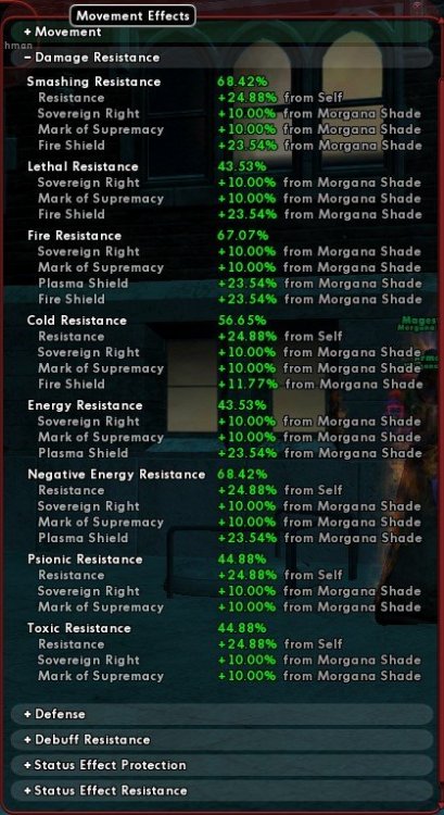 18. I've haven't had a lot of time to play, but my Necro/Thermal is at 40 now. I took a screenshot below, of the Combat Attributes. Basically, the Zombies are now mini-tanks with strong resistance to almost every damage type. Soul Extraction is being used as a mule to hold two 10% resist Pet IO's. This working out really well. I'm running Night Ward missions which are very tough for most builds. The zombies are just tearing through that content solo.