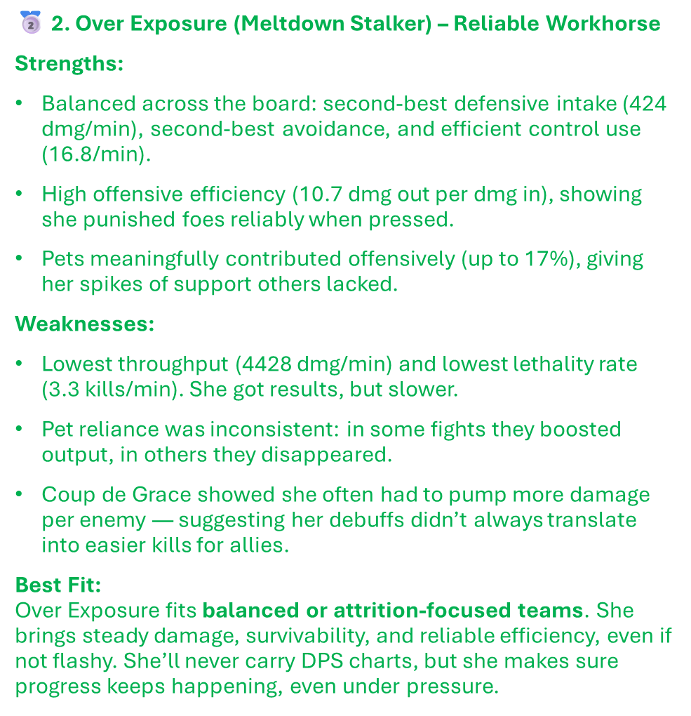 Dark Current Posted September 21 Author Posted September 21 My deep-dive analysis of Strats and Stats from Over Exposure's team trials is up on YT. Check it out to see how the 'Meltdown' Stalker build fared against her 3 predecessors' builds. Key Takeaways: Incoming Damage metrics... Outgoing Controls metrics... Enemy Takedown metrics... Outgoing Damage metrics... Cathy's Rankings... 2