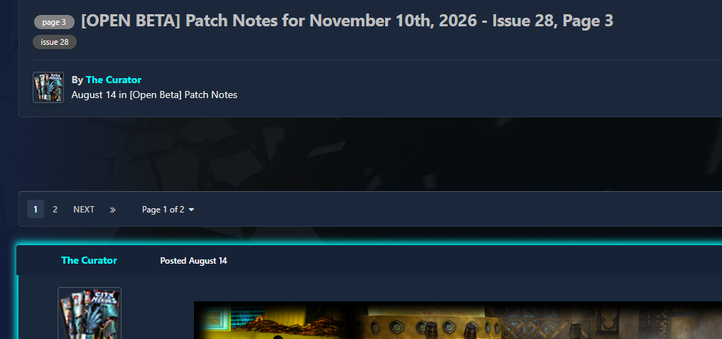 Developer Cobalt Arachne Posted 6 hours ago Developer Posted 6 hours ago 6 minutes ago, DrunkFlux said: what if the content needed to unlock them gets outdated enough that newer players struggle to get it unlocked because people have moved onto other content in the time? The Tests of Combat repeatable missions added to the Labyrinth in this update can be solo'd at -1x1 Difficulty for full Obol rewards. No risk of being left behind. There's nothing intended to be locked or gated. The costume unlocks are just fancy alt versions of parts you DO have at creation. One purpose of unlocks was to help advertise the new zone's content and give players who a participated a memento for their time. You'll notice the Obol cost for costume pieces is set intentionally very low. This isn't meant to be a grind, it's a content participation check. 6 2 1 1 Love this game and its community? Want to give back? Volunteer as a Game Master! Help make Homecoming the best it can be! Writer of the Patch Notes Red side, best side!