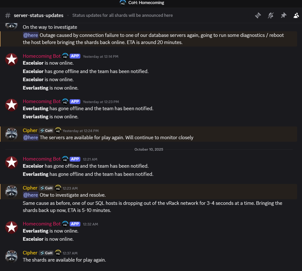 Glacier Peak Posted 10 hours ago Posted 10 hours ago ...that the Homecoming Team has done a great job letting us know something ain't right, when we can expect it fixed, and what they're doing about it. Whether its those bright orange banners at the top of the official forums... ...or pings on their server status updates on the official Homecoming discord... I gotta give props to our volunteer team keeping the lights on and letting us know when the hamsters chew through the wiring! 4 3 1 I lead weekly Indom Badge Runs / A newer giant monster guide by Glacier Peak / A tour of Pocket D easter eggs! / Arena All-Star Accolade Guide! Best Post Ever....