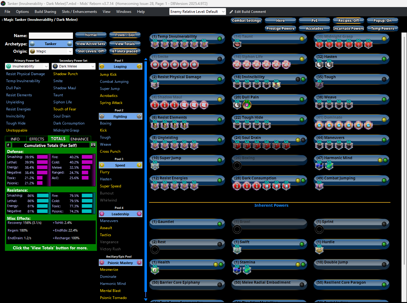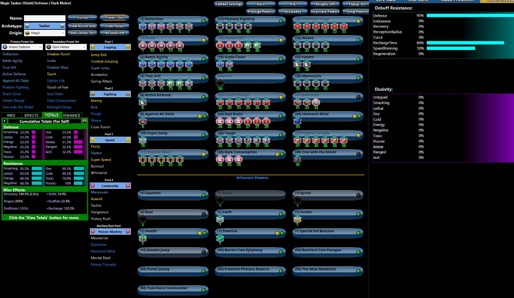 Warshades Posted 21 hours ago Posted 21 hours ago 12 hours ago, ResToons said: I was sold that Invincible def set was the best route to go but they convinced me will power or shield was better. Shield is in fact really good, you'd pretty much be splitting hairs trying to pick between shield and invuln, both can be built to be insanely durable. I would recommend /dark for shield just to have access to a heal to add some sustainability and Dark Consumption for endurance (also helps that /dark is light on endurance as an attack set). Invuln doesn't really need to go with /dark for Siphon Life as it's high def/resist and access to DP is sufficient imo, so you could go for other secondary options. Posted a sample shield/dark below. The build is focused more on trying to reach high resists, I don't know that I would recommend going this far for it as it makes several sacrifices, but it should be very durable. With 2 stack of the SMoT proc, you'd be hitting 89% s/l resist, 87% e/n/f/c, 85% toxic, and 76% psionic without relying on OwtS, you could honestly swap that out for taunt. Again, at this point it's more about what flavor of tank you prefer and like playing more. Both invuln and shield can hit such high survival stats that only extreme cases and specific scenarios would ever pose any issues. Willpower has a few holes that make it, imo, less of a durable armor set than invuln or shield. Regeneration takes time to work, so you're inherently more vulnerable to burst damage. WP can easily cap s/l resist, but you won't be reaching such high e/n/f/c/tox/psi resist with it that you can on invuln and shield. Additionally, it's DDR is pretty low and your defense can get floored more easily than it would on invuln or shield, at which point you'd be taking a lot of hits. It also wants RttC saturated with 10 foes around you to max out the regen bonus. You'll end up losing a good portion of your regen if you only have 1-2 enemies around you. With a saturated RttC, you could hit ~205 hp/sec regen with Vigor Core alpha. Drop the foes surrounding you from 10 to 1 for RttC and that regen will drop to ~130hp/sec. It will still do fine in most content, but there will be more scenarios where high burst damage that's not smash/lethal can create problems. Tanker (Shield Defense - Dark Melee)7.mbd